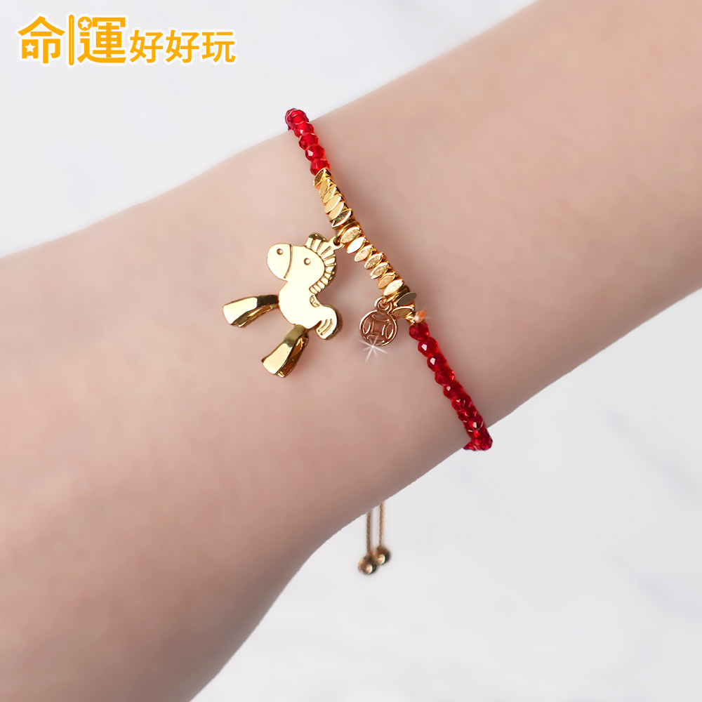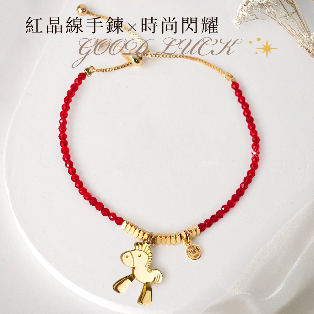 傳統習俗相信紅色可以保佑平安,有驅邪避煞的功效,尤其在「本命年」時會特別佩戴紅繩避邪,並祈求平安與好運。命運好好玩專為2026年太歲馬年設計一款時尚版的紅線手鍊,以切面紅晶串連成線,能在光線下閃閃發光、折射出閃耀光芒,不僅延續紅線的寓意更提升了質感,讓開運也能很時尚!