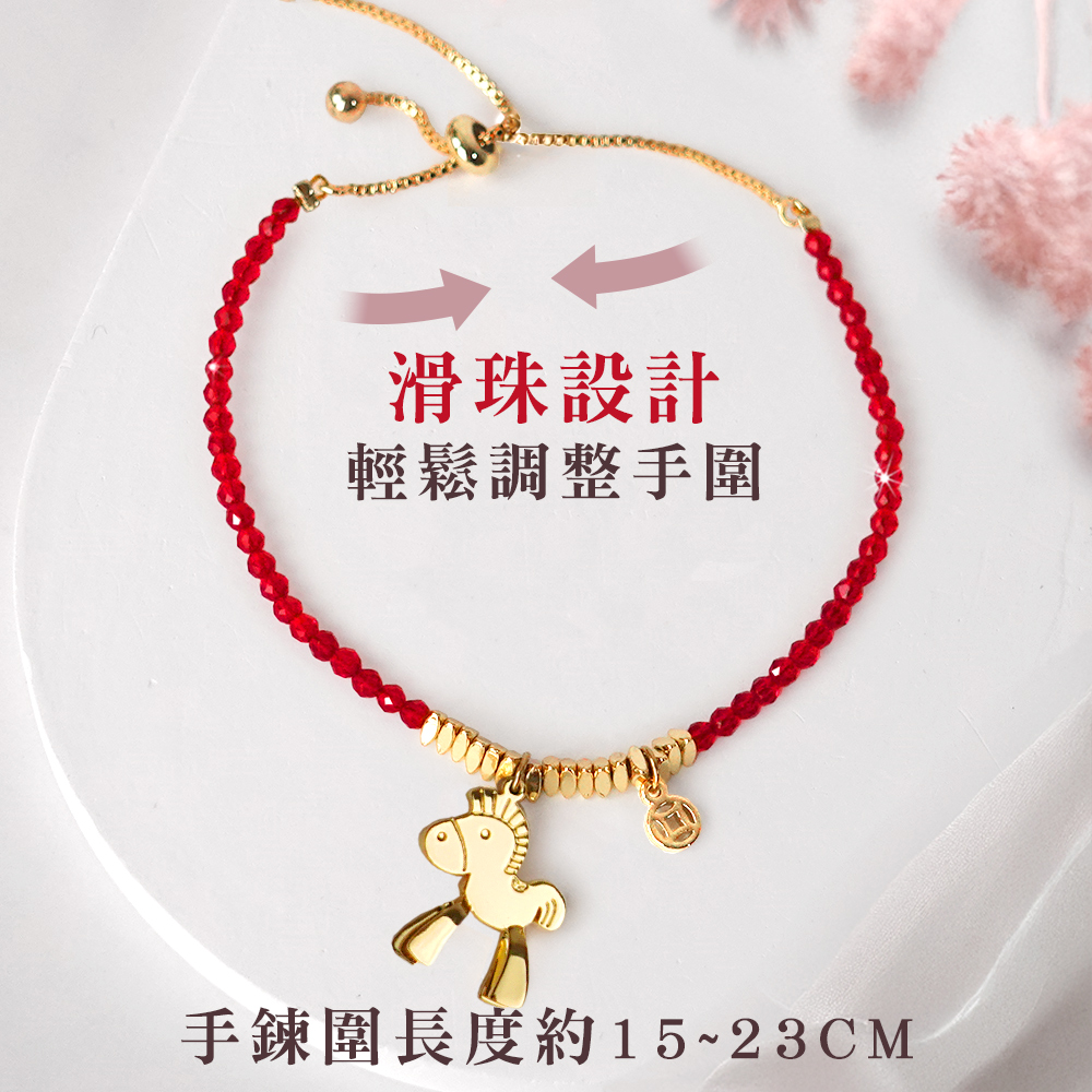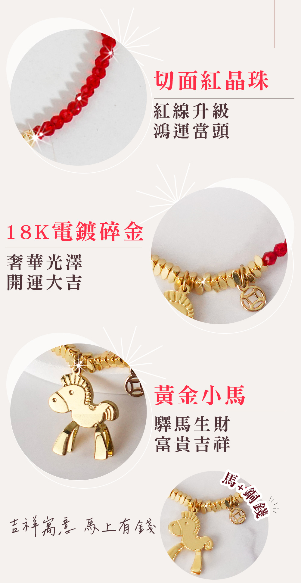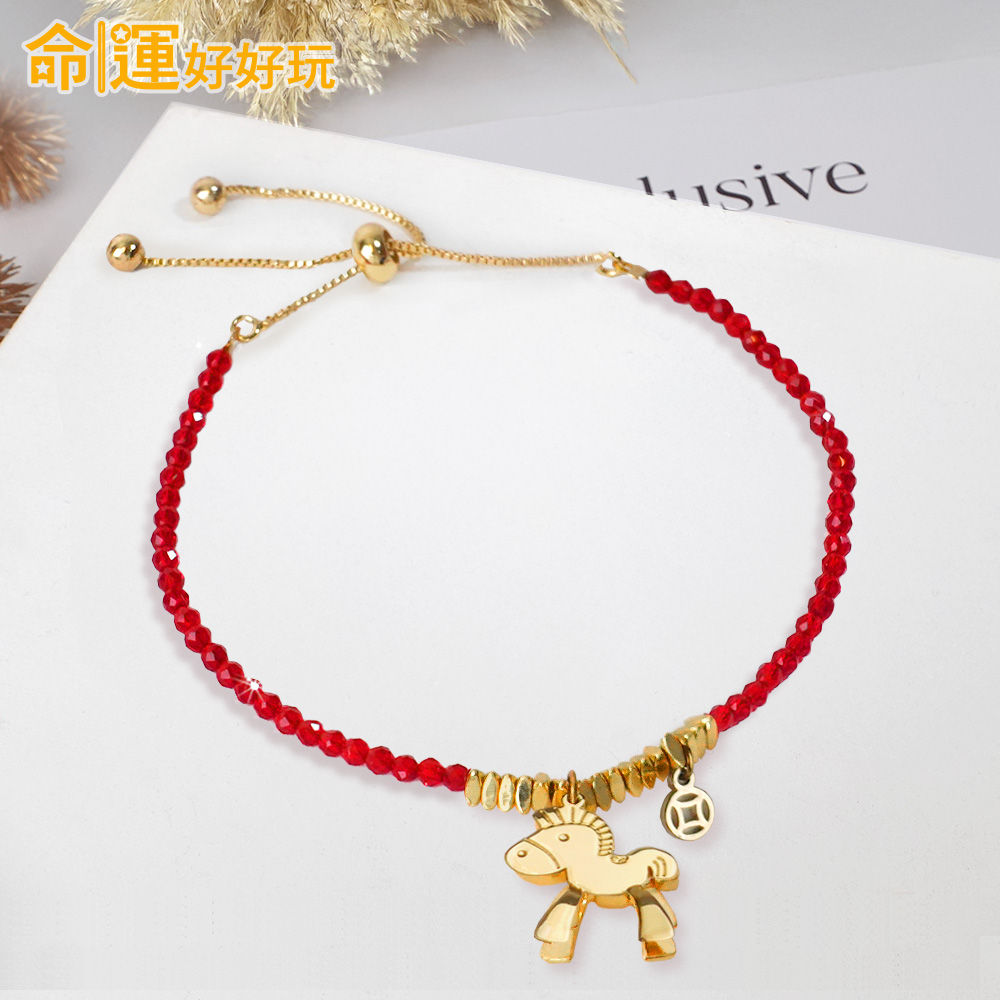 在命理中,「驛馬星」象徵移動、奔波、機會與變化,「驛馬」若與「財星」相遇,就是所謂的「驛馬財」。這款手鍊上的「金色小馬+銅錢」除了吉祥寓意「馬上有錢」,更象徵在馬年能鴻運高照、財官豐收。