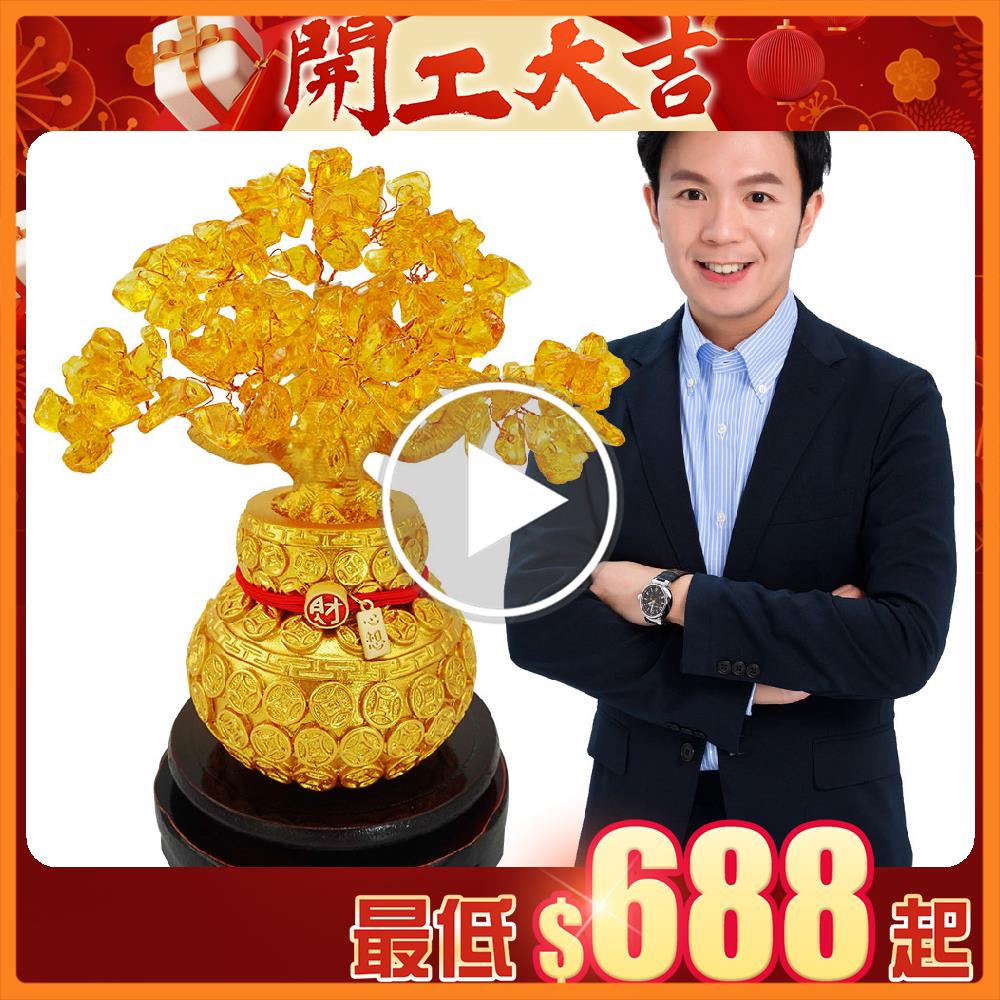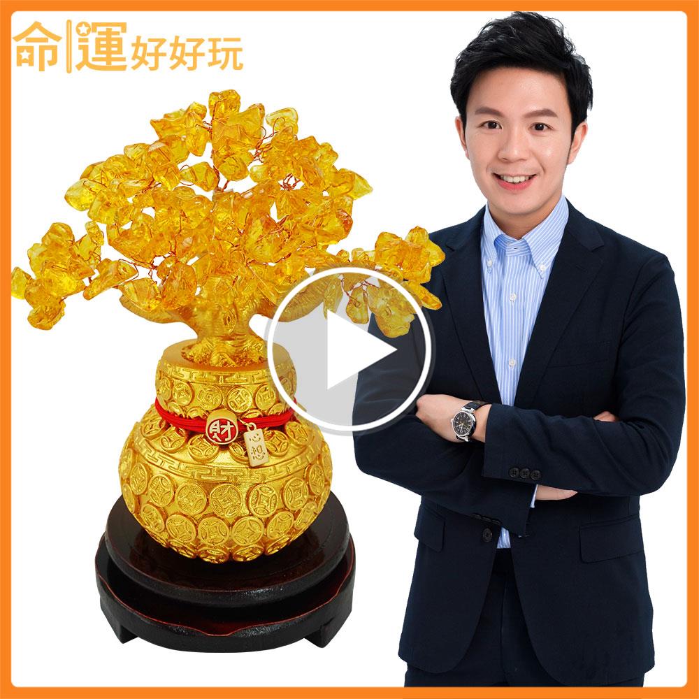 以「樹木」作為開運擺件這樣的設計,在風水學中被稱為「活性能量陣法」,因樹木象徵生生不息的生命活力,在樹上點綴天然的黃水晶寶石,能讓居家的財富能量像樹枝般開枝散葉,催發財機,宛如搖錢樹,並且以百財葫蘆袋做為根基,立體雕刻的百餘枚古銅錢,象徵將財富盡收入口袋中,最後以招財鴻運線繫住擺鎮,搭配附贈的財庫符,將財氣緊緊鎖在家中,化解所有漏財問題!