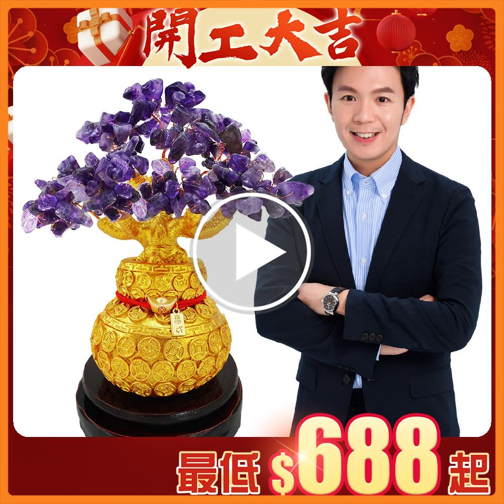 以「樹木」作為開運擺件這樣的設計,在風水學中被稱為「活性能量陣法」,因樹木象徵生生不息的生命活力,在樹上點綴天然的紫水晶寶石,能讓事業貴人的能量像樹枝般開枝散葉,催發人緣財脈牽引事業財,並且以百財葫蘆袋做為根基,立體雕刻的百餘枚古銅錢,象徵將財富盡收入口袋中,最後以元寶鴻運線繫住擺鎮,搭配附贈的財庫符,象徵鴻運當頭,將所有人緣財氣緊緊鎖在家中,帶來各路貴人相助!
