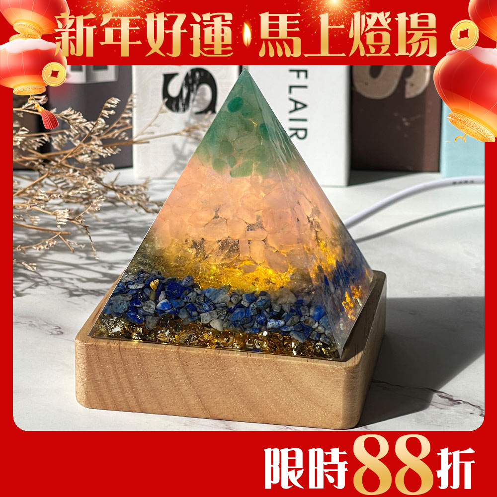 五行補運金字塔燈的主體外型『金字塔』─自古以來都被認為有著接收宇宙能量的神奇力量,就像一個人打坐時,雙膝與頭頂也是形成一個金字塔型,而這個姿勢也是最能接收天地能量。內部組成的結構特選五種不同材質的五行晶石:綠東菱(木) →粉水晶(火)→黃水晶(土)→金箔(金)→青金石(水),經過特別精選搭配的五行晶石不但外觀夢幻繽紛,而且能夠形成強大的五行循環磁場,疏理人體的混亂磁場;運用光能,活絡並加強個人氣場、放大金字塔的能量,讓你的運勢藉由光源、晶石和金字塔的加乘作用下,達到元神光彩並有效提升個人整體運勢的功效。