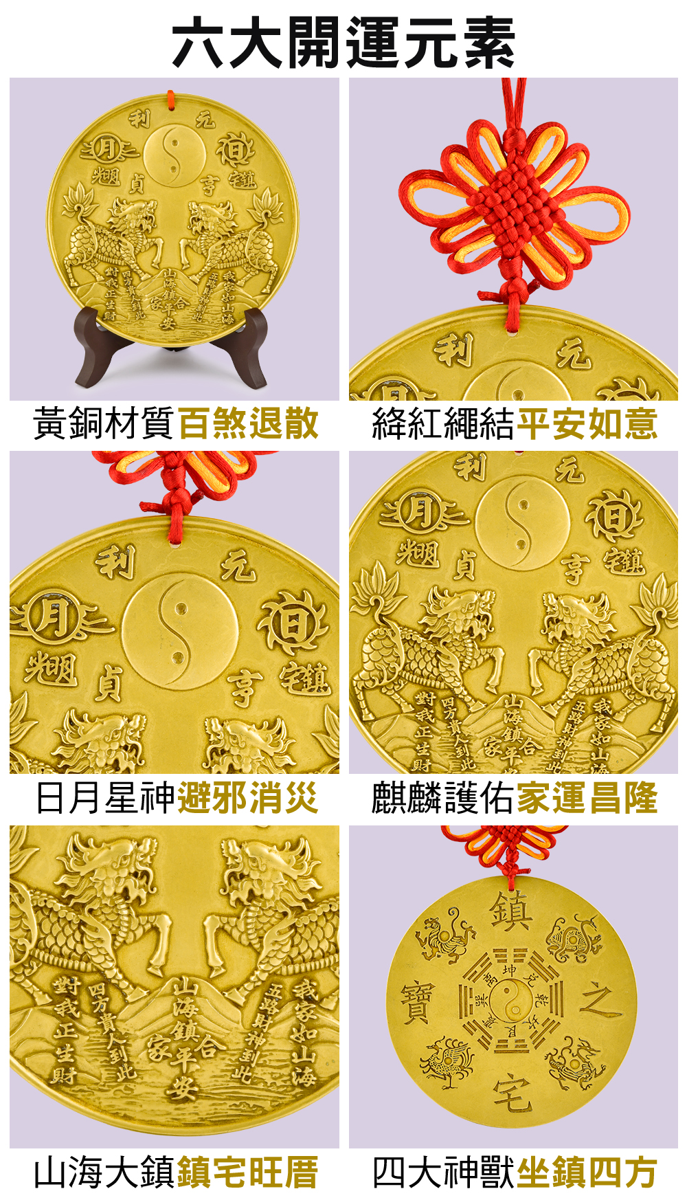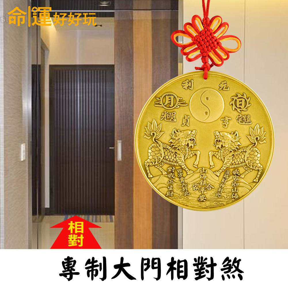 山海鎮是台灣常見的風水鎮煞避邪物之一,通常用於化解屋外煞,例如:大門對大門、大門對樓梯、藥罐煞、壁刀煞等。而麒麟駕到黃銅山海鎮同時集結「黃銅」、「麒麟」、「四大神獸」等開運元素於一體,自然效力有別於一般山海鎮!除了黃銅為靈動最強的法器製材之外,其中的「瑞獸麒麟」更是普遍被應用於化解各種屋內煞氣,其亦具備使家運昌隆、人丁興旺之效。