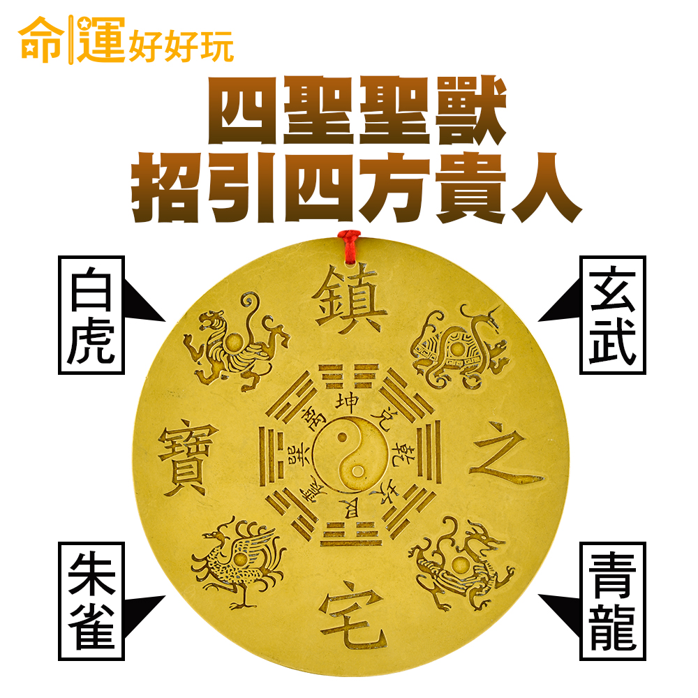 四大神獸青龍、白虎、朱雀、玄武,是中國神話中的萬獸之祖,它們分別鎮守四方,調陰陽、順風水,玄武福澤健康長壽,青龍君臨天官賜福,白虎懲惡揚善驅災,朱雀則可調和陰陽;將四神獸刻印在山海鎮背面可加乘山海鎮法效。