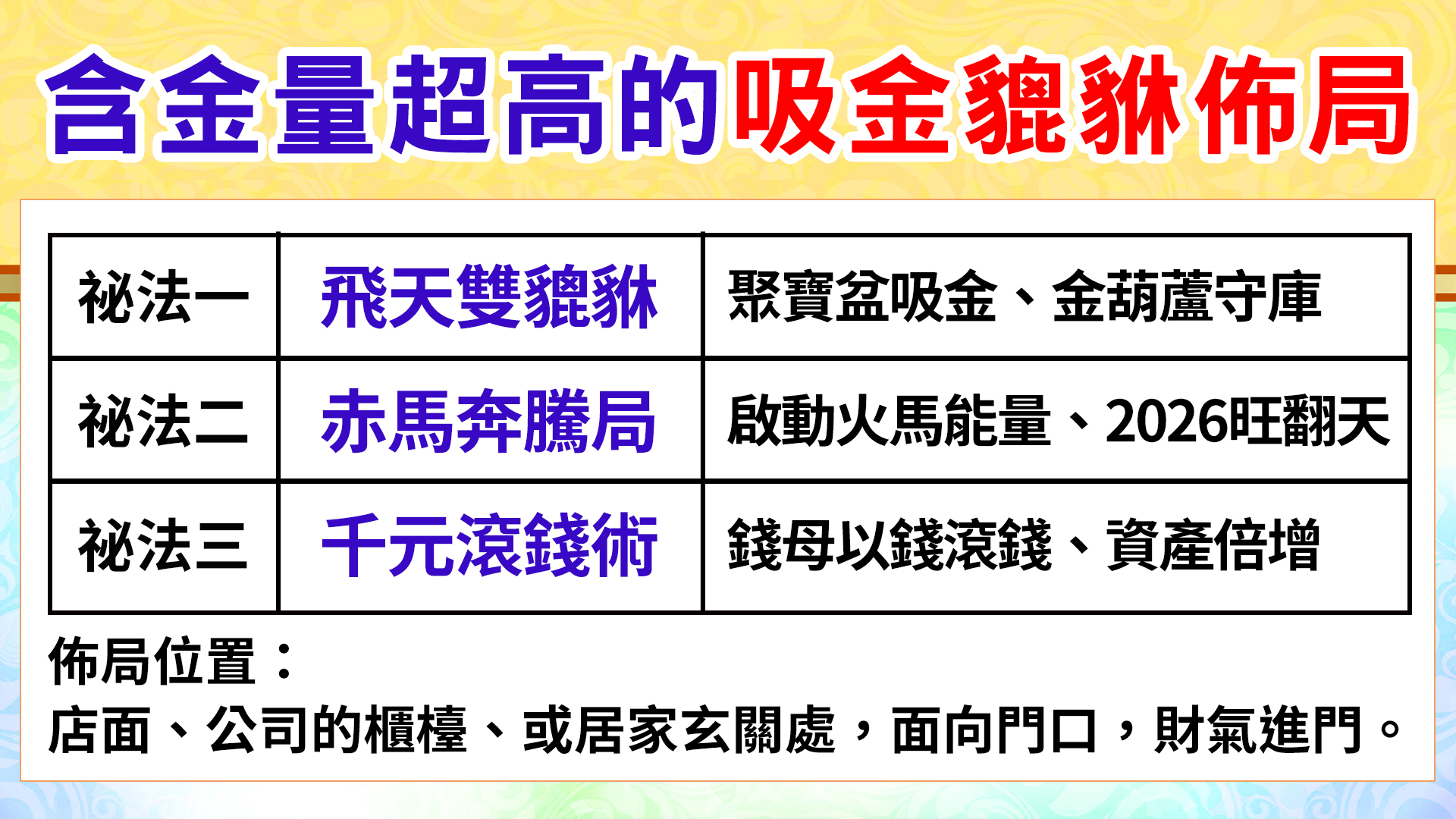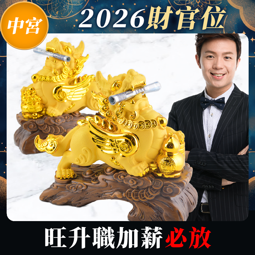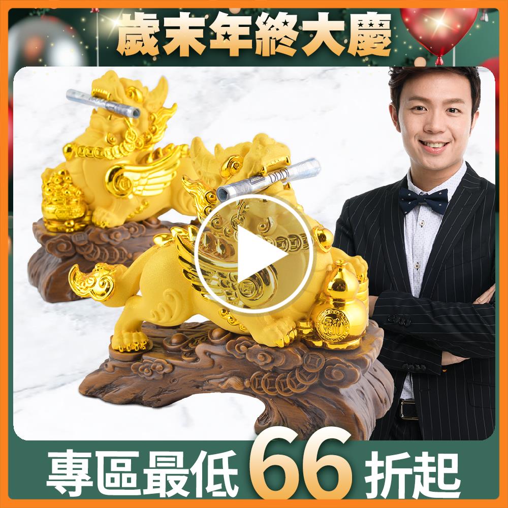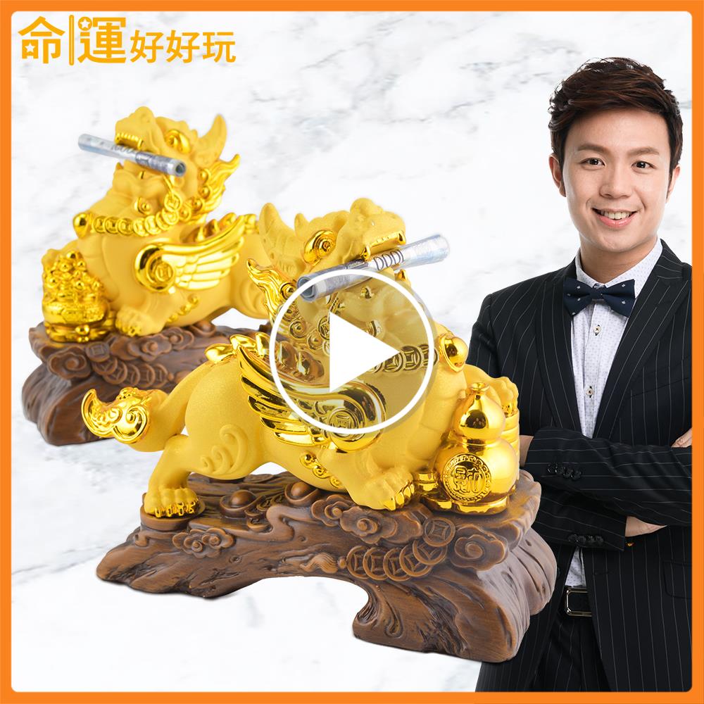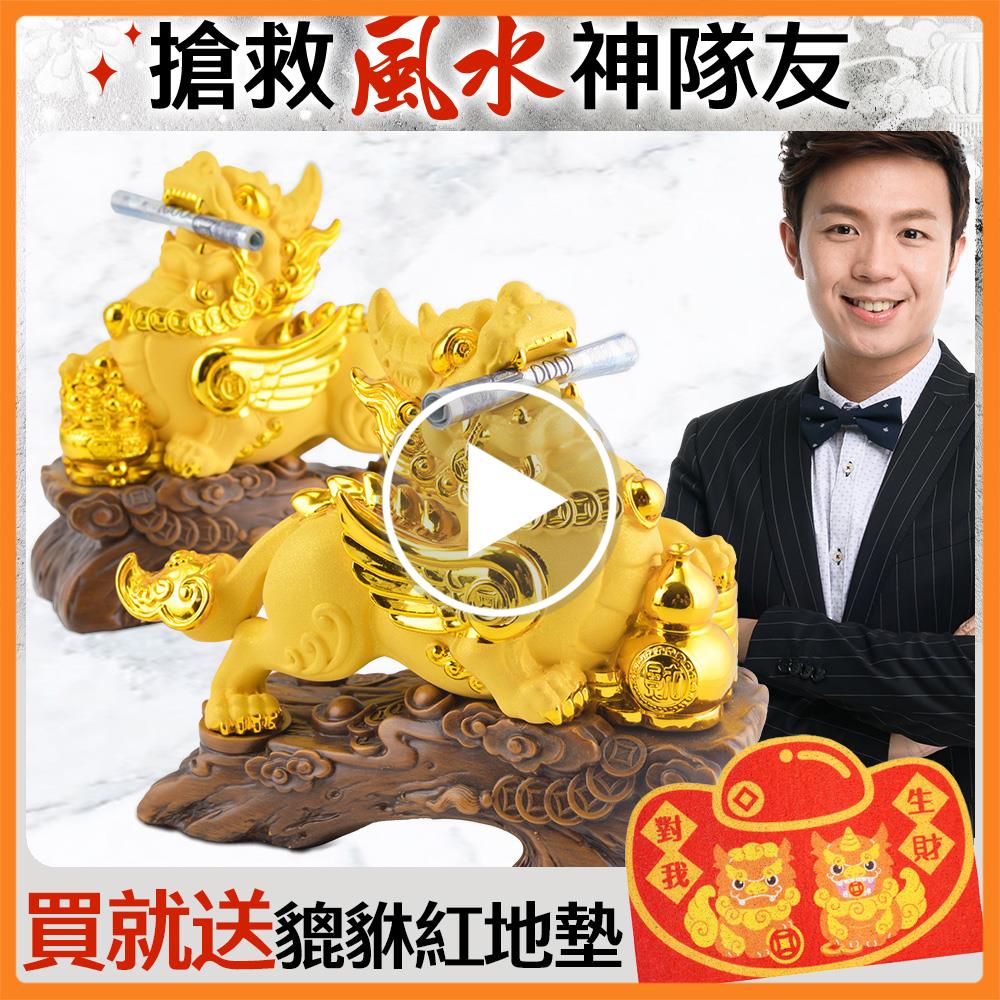 全新升級財寶霸王吸金貔貅擺鎮,更巧妙地使用「絨沙霧金」與「鍍面亮金」的對比工藝,讓貔貅擺鎮看起來更顯瑞氣千條!此款擺件的六大吸金開運設計,能迅速咬錢讓你不用再賺辛苦錢!(一)飛天貔貅–讓你財運一飛衝天,迅速網羅天下財,化危機為轉機!(二)古銅錢串–鎮宅化煞,串聯財氣綿延不絕(三) 如意鎖財扣–象徵富貴吉祥好兆頭!鎖進錢財只進不出(四)葫蘆+錢幣堆–葫蘆吸金納福制化財煞+錢幣堆疊象徵事業步步高升(五)高端大氣禪風木紋底座–招來福祿降臨(六)八吉祥琉璃聚寶盆+五行水晶–供養貔貅效力最強,隨時啟動八方財富氣場,補足五行所缺,助益財路順暢。