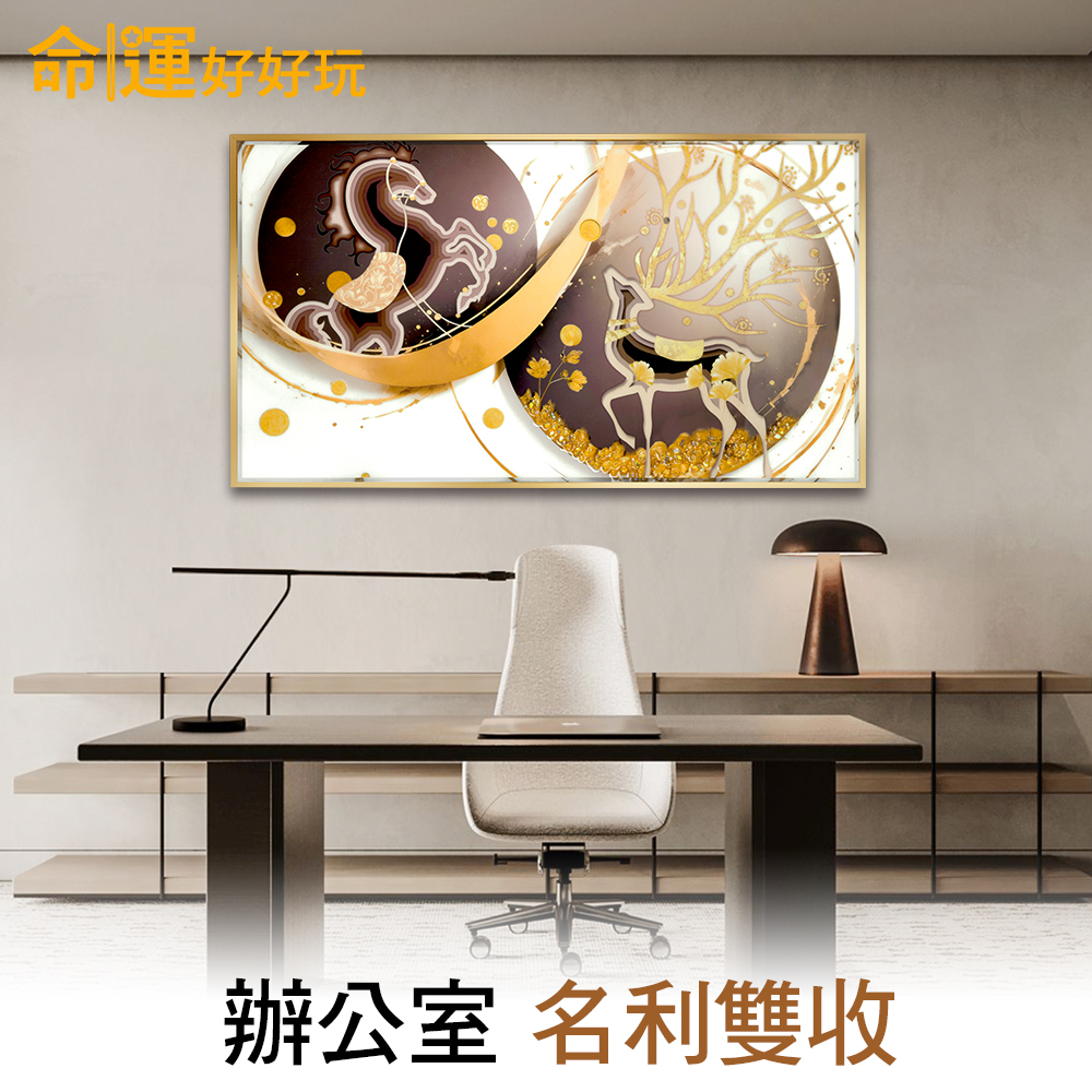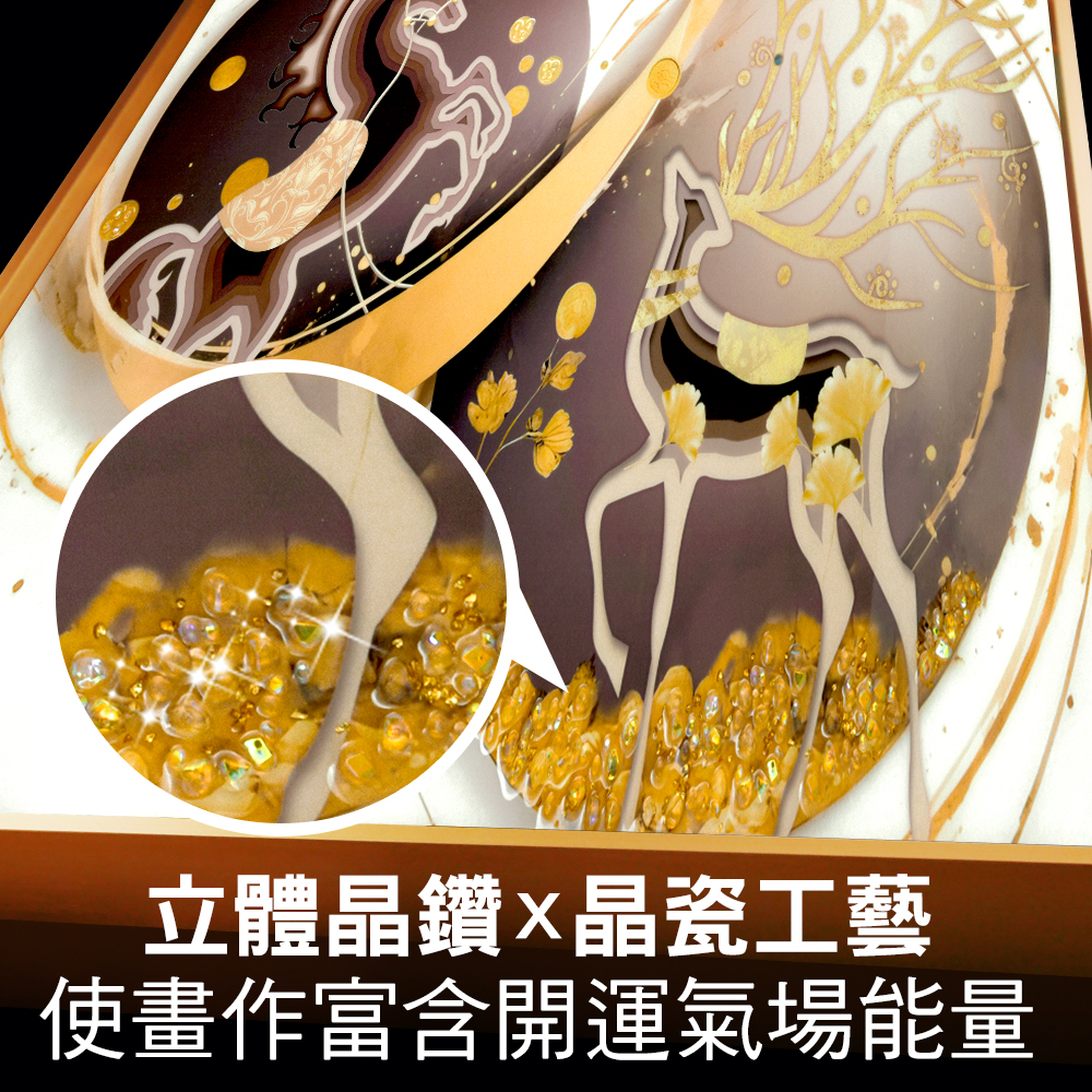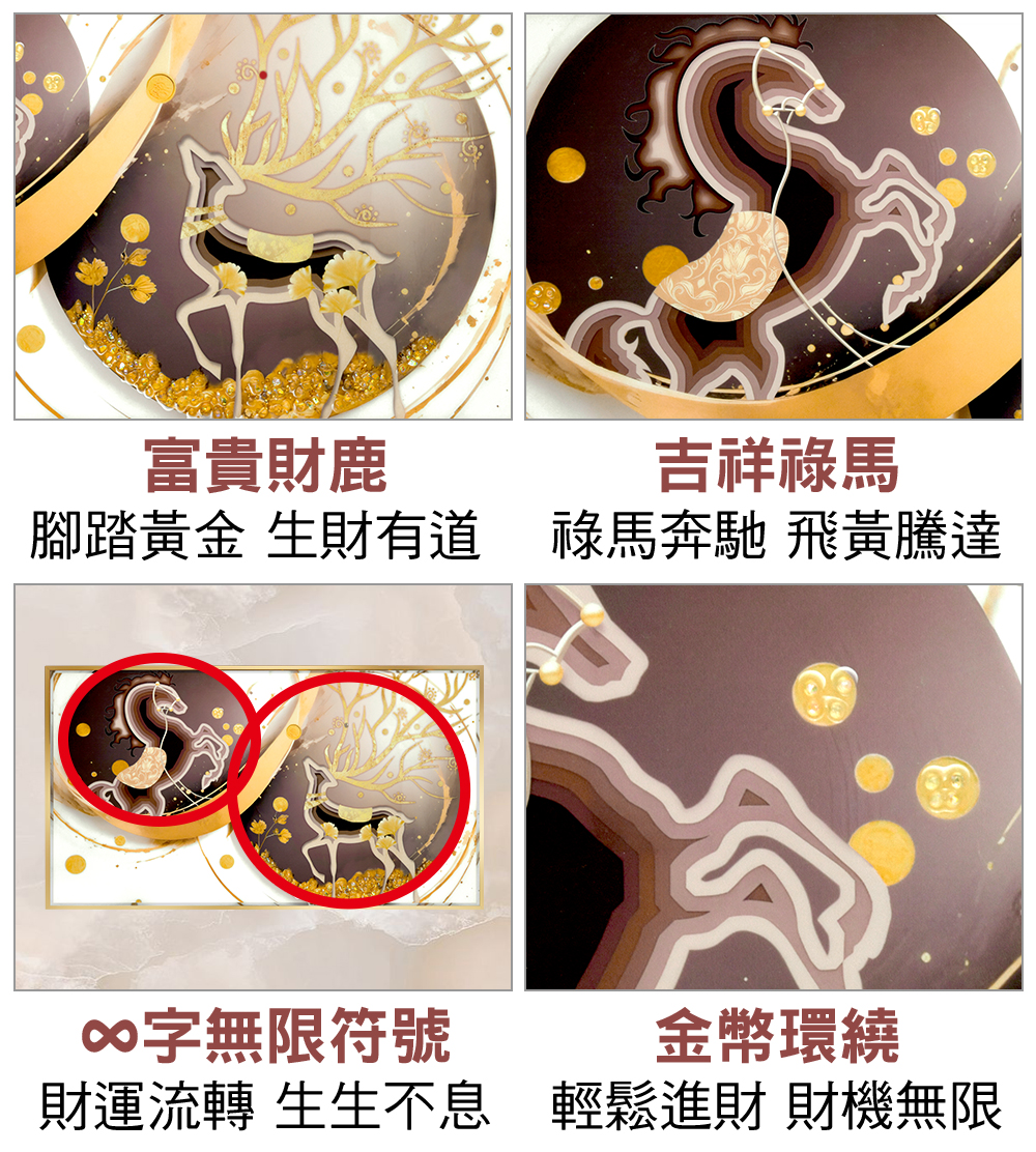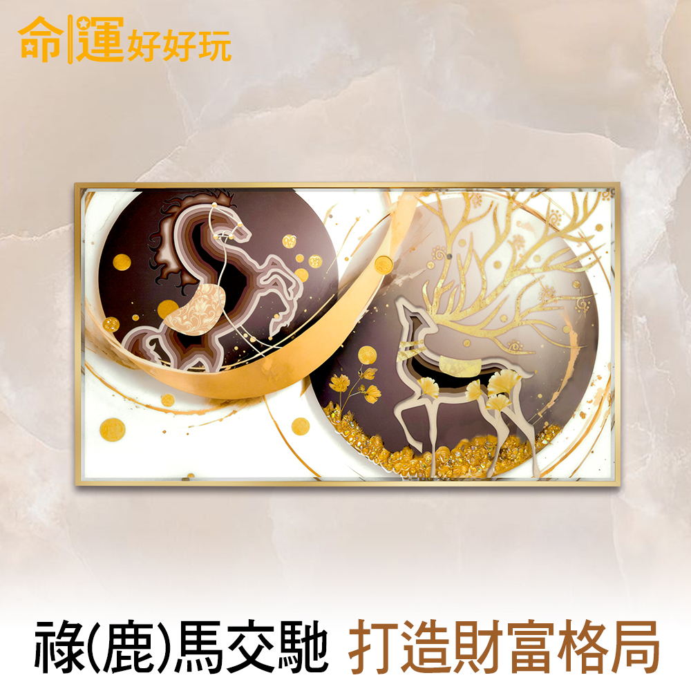 祿馬交馳一詞緣自於紫微斗數格局中,是為大富大貴之相,此格局除了引領財運一路前行之外,也有工作事業上獲升遷之吉兆;若想透過後天打造祿馬交馳的大吉格局,只需擺放「貴人無限祿馬晶鑽畫」,採用最新技術-雙層融合晶瓷、白鑽製成,將開運材質元素融合於畫中,富貴財鹿腳踏黃金,象徵生財有道財祿廣進;吉祥祿馬奔馳,活絡聚財能量磁場,將事業衝上最高峰;8字無限符號,使財運流轉生生不息;金幣環繞,寓意錢滾錢,財機無限大發。整體畫作呈現風生水起、翻轉運勢的震撼感,掛於客廳辦公室能快速改變氣場,突破僵局,立即催旺貴人運提升事業運!