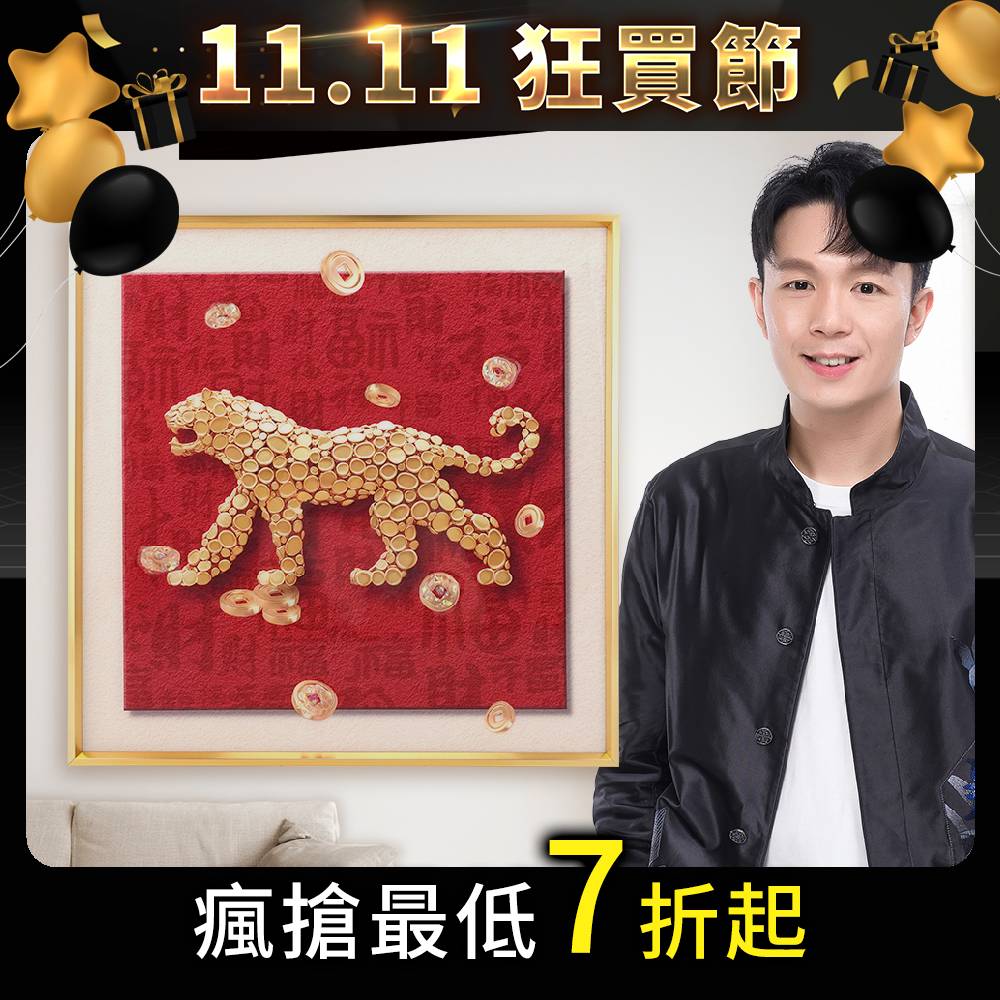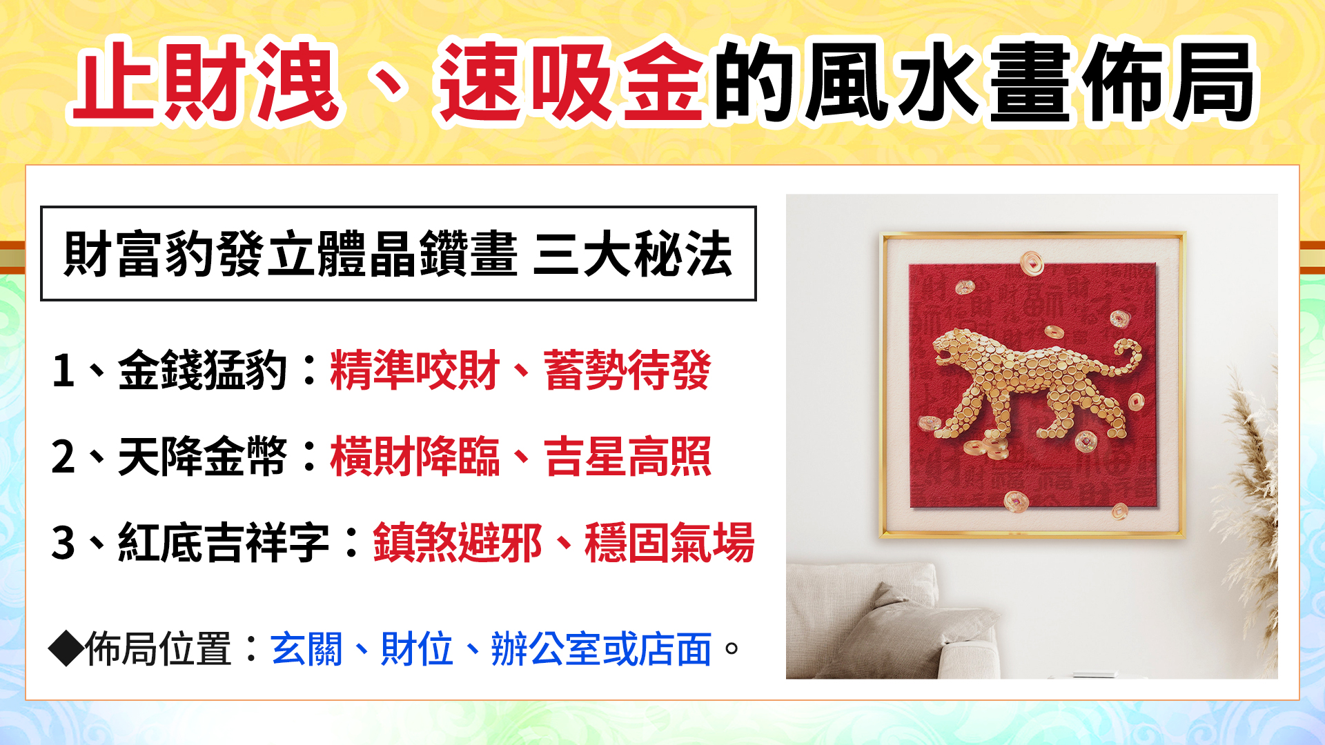 金錢豹身上的花紋排列如同金幣紋路,一眼望去就像財富遍佈全身,象徵富貴圍身、財源滾滾。畫中天降銅錢灑落四方,如橫財降臨,自帶納福招財之意,帶動整體財運循環;畫作富有張力,融合了財氣奔湧與掌控全局的象徵,創造出「財從天降、事業猛進」的能量。搭配立體晶鑽裝飾,使整體畫面更具動感,財運之光宛如金光流動,生生不息。