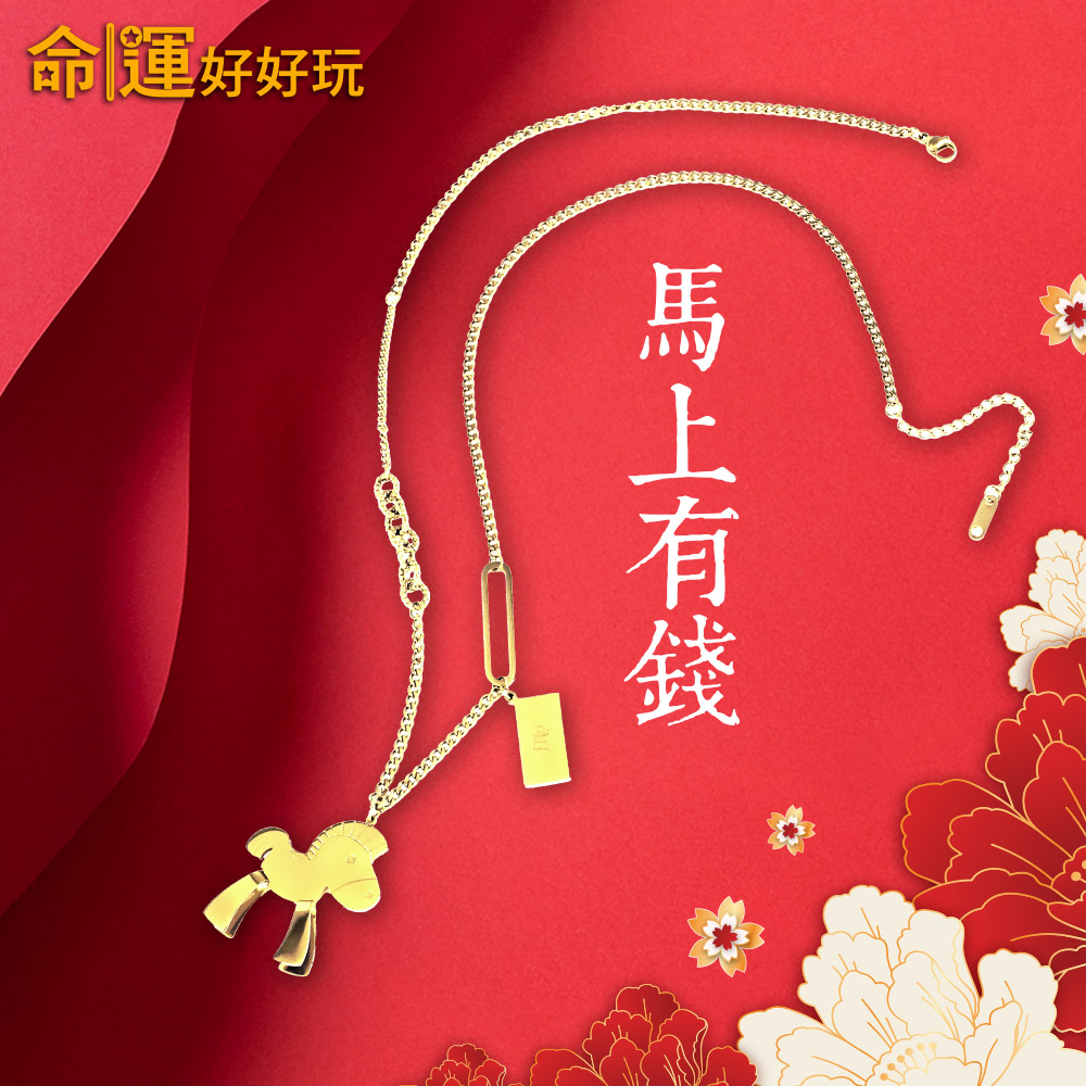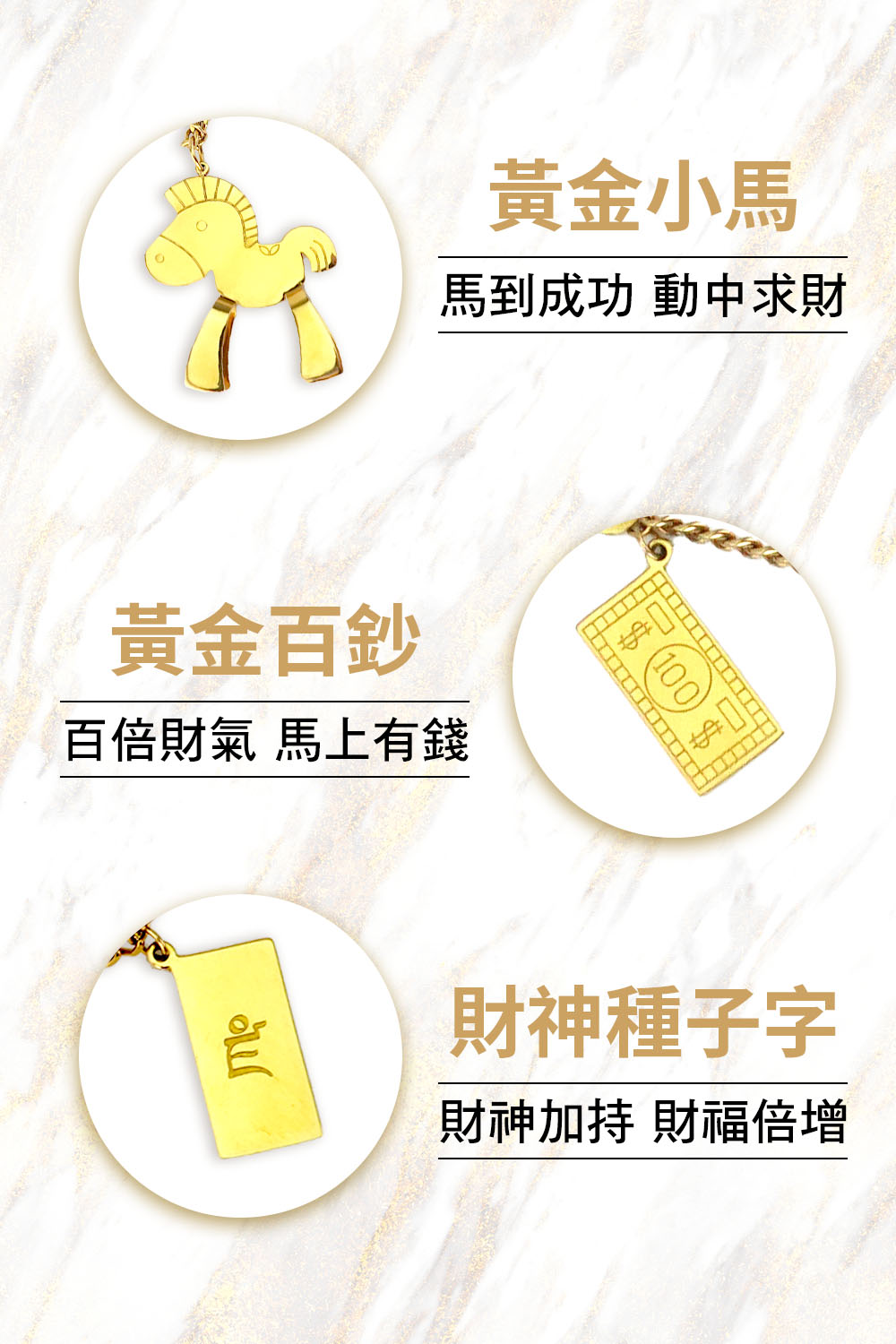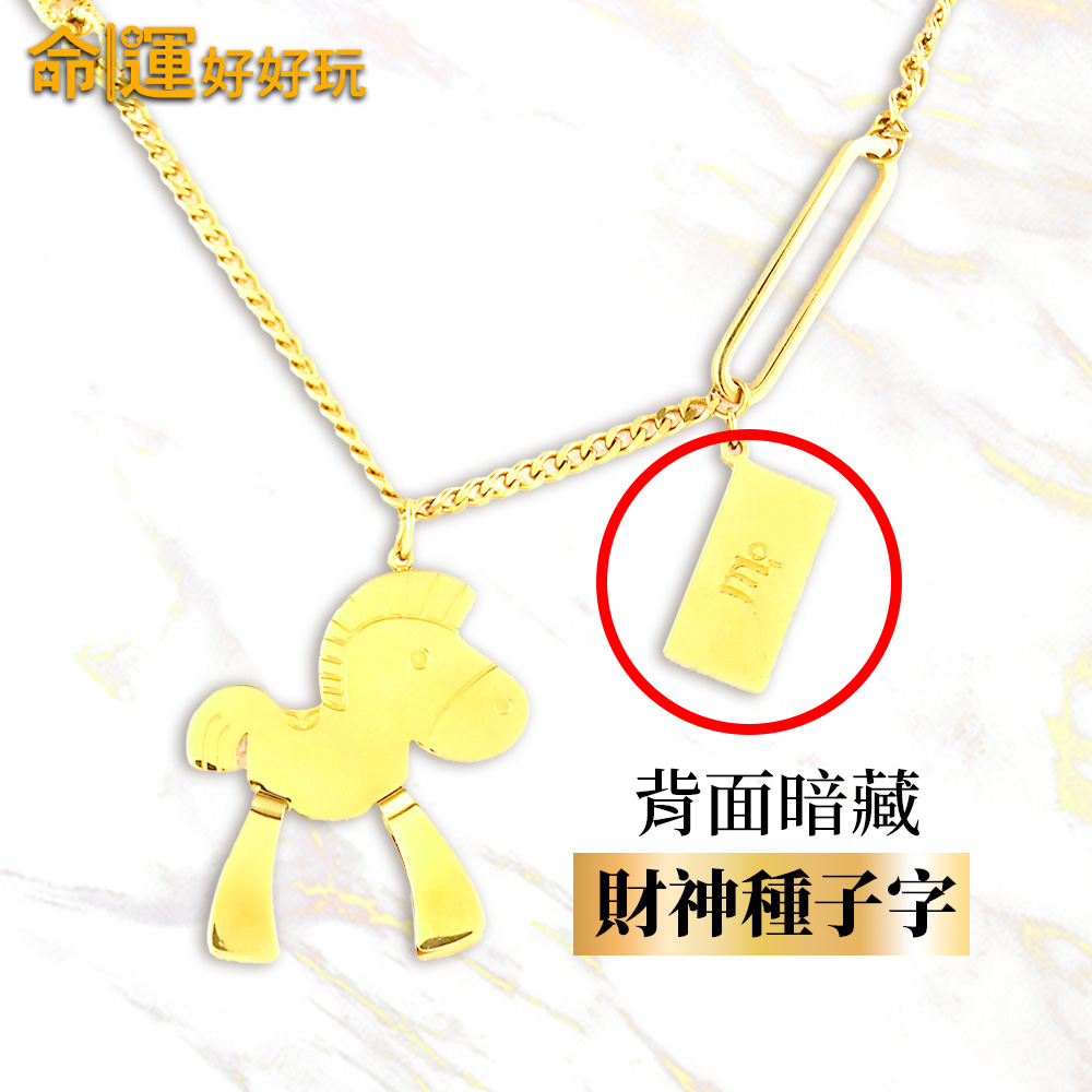 馬,是象徵不懈奔馳、勇往直前的力量。在命理中,「驛馬財」象徵在行動中尋求財富,啟動事業財的動力,開啟財運的關鍵能量。【馬上有百富】系列飾品,主要開運元素有「黃金小馬」+「百元金鈔」即是=「馬上有錢」,將行動力與財富磁場完美結合,而百鈔的背面所暗藏的黃財神種子字寓意黃財神護佑加持財富,為你帶來無盡的財源與無形的貴人助力。