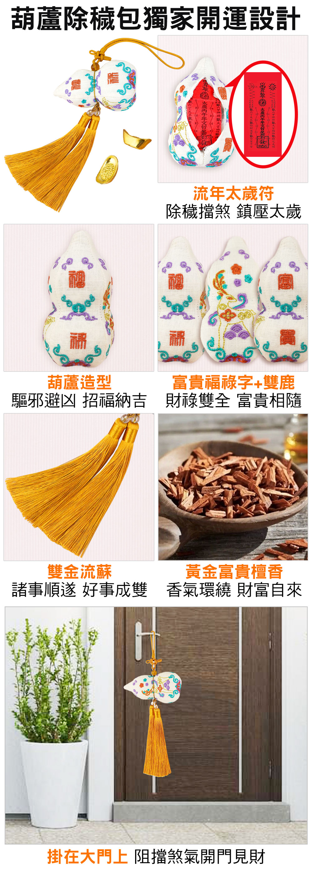 只要將「財鹿葫蘆除穢包」掛於大門內外、陽台出入口、落地窗邊、廚房門口或車內後視鏡,即可為居家或移動空間打造一個強大的開運磁場,讓財氣飄進來、霉運散出去,新的一年家運亨通、財祿雙收、富貴滿堂!