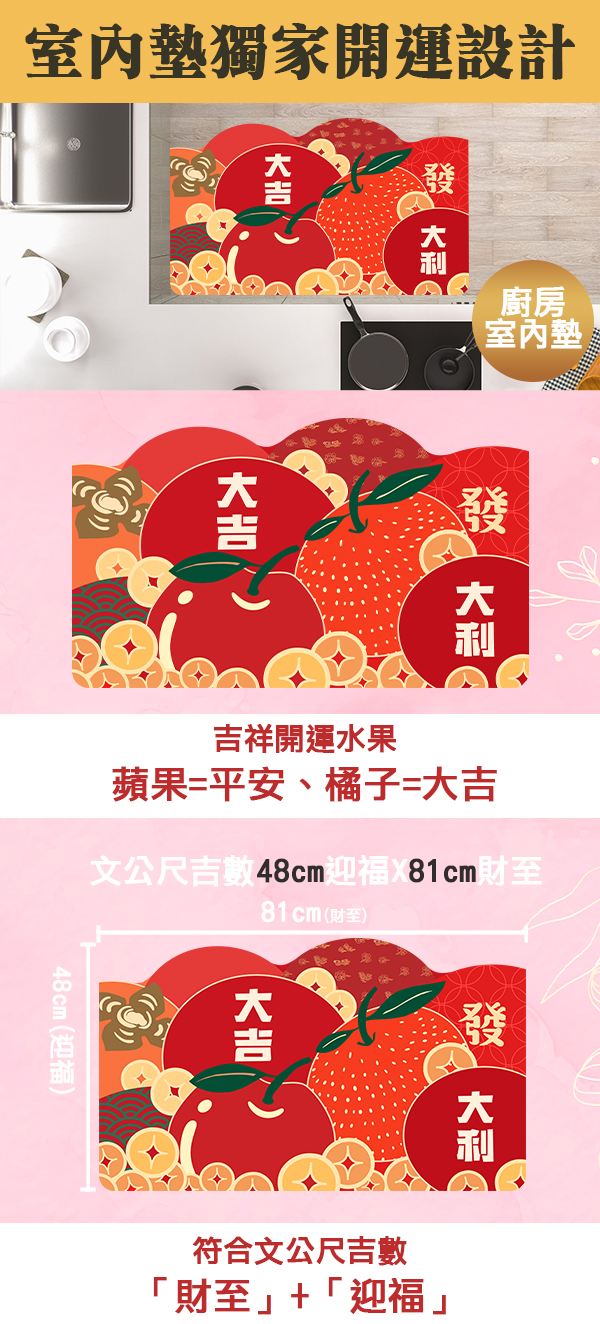此次特別設計加大款「果然好運硅藻土地墊」,採用硅藻泥材質,具吸水速乾特性,能維持環境清爽並祛除晦氣以紅、橘色調搭配遍地錢幣,象徵運勢紅紅火火、財氣蓬發;吉祥水果圓潤飽滿造型,象徵食祿豐收無缺,闔家財運興旺!擺放在廚房=家中聚寶之地旺食祿財;放在臥室也能有效催旺貴人財,讓你人脈生錢脈!腳踩紅地、富貴開啟,讓整個家都旺起來!