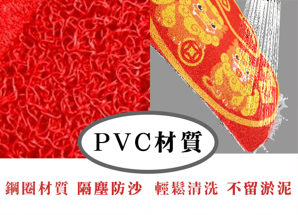 嚴選耐磨PVC圈絲,堅固實用,能有效刮除泥沙塵穢,保持門口潔淨。材質可水洗,清理方便,也象徵去穢除障、好運常在。