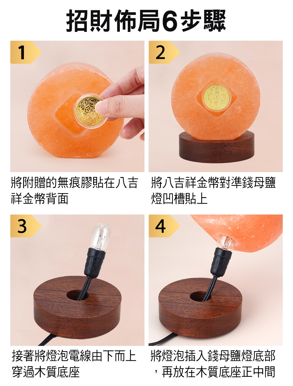 1.將附贈的無痕膠貼在八吉祥金幣背面後貼在錢母鹽燈凹槽處。