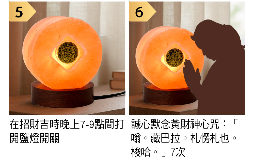 4.於招財吉時戌時(晚上7-9點)打開鹽燈,並誠心默念7次黃財神心咒【嗡.藏巴拉.札楞札耶.梭哈】。