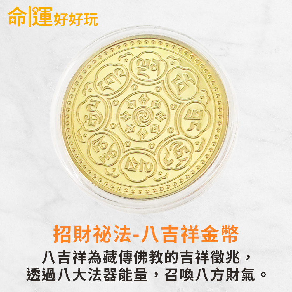 八吉祥的祥瑞能量結合億元錢母招財能量,形成強而有力的聚財磁場,並於招財吉時祈請黃財神加持,匯聚各方財富好運,開拓廣大財富版圖,輕鬆坐擁八方之財!