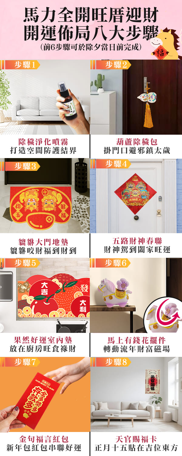 1.先使用除穢噴霧噴灑於居家空間→掛上除穢包→大門口鋪設紅地墊→貼上春聯→室內地墊鋪在廚房→馬擺件放置於客廳或玄關→包紅包給家人、長輩→在家宅東方貼上天官卡。