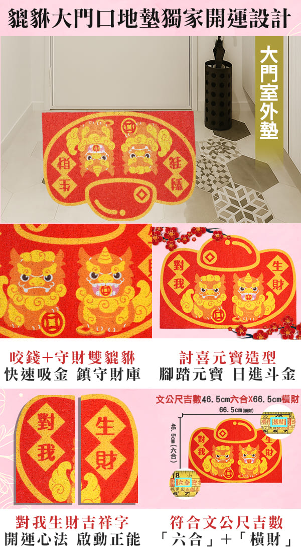 湯鎮瑋大師獨家設計「對我生財貔貅大門口地墊」,特別依照文公尺吉數訂製並結合流年風水概念,以元寶造型大紅地墊喜氣迎春+左右雙貔貅快速吸金,搭配對我生財字樣;放在住宅中最主要的納氣之口=大門口,接引地氣引財氣入宅,讓新的一年能步步生財、日進斗金!(貔貅地墊單品詳介)