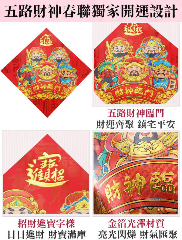 若想要一年開春就獲得超強吉運照拂,『貼春聯』這個步驟絕對不能馬虎!「五路財神進寶春聯」代表五路財神齊聚,帶來金銀財寶,同時鎮守家中保佑家庭成員平安!此款春聯特別設計金箔材質印製,光澤閃爍、進財效力加倍!
