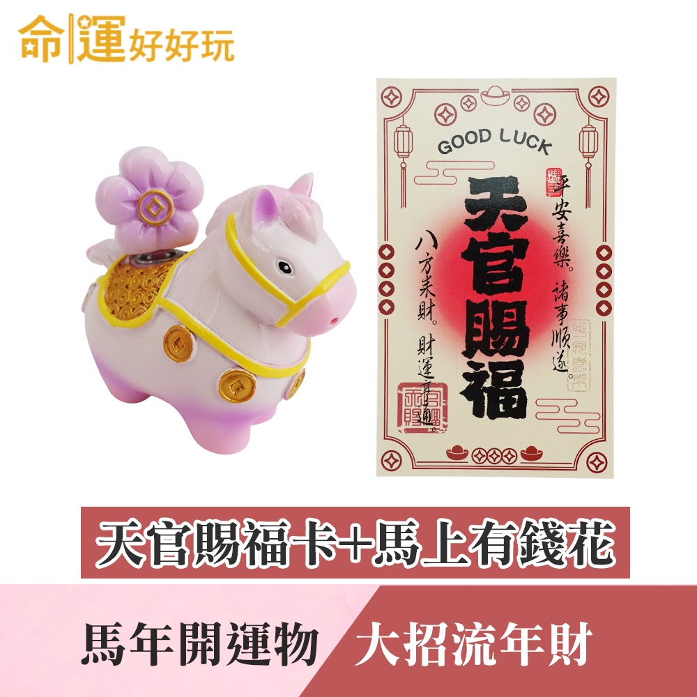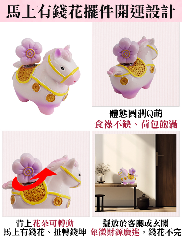 馬年最應景的吸金小物「馬上有錢花擺件」,療癒圓潤造型,順時針旋轉馬背上的花朵,象徵動中生財,隨時有錢花;在外奔馳吸金,財富留得住!新的一年,讓你365天都不缺錢花,並如同這匹招財千里馬一樣勇往直前,搶錢第一快!在運勢較為低迷時記得順時針轉動馬背上的「有錢花」,可達到逆勢轉運之效。