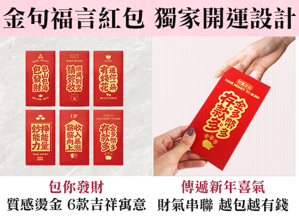 想要在新的一年財運豐隆、人脈生錢脈的話,還有一個必殺技祕法!就是在新春期間用「喜慶吉祥話紅包」搭配質感燙金的新年設計,啟動金印錢潮入袋!包給親朋好友,分享新春的喜氣能量,幫助你越包越有錢,來年財富旺翻天!
