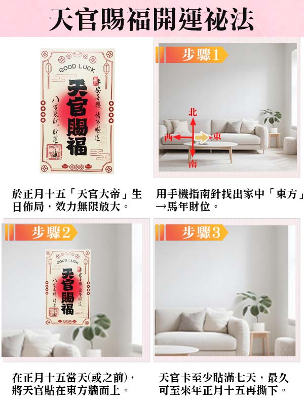 馬年開運過年組限定!「阿湯老師指定★天官賜福開運法」:農曆正月十五(國曆2026.3.3)這天是天官大帝誕辰,在這天祈求天官大帝開天庫、賜下今年的財富會特別靈驗!「天官卡」須於正月十五當日(或之前)貼在或放置家中「東方」,至少需貼滿七天,或可至來年正月十五再換新,即在這一年闔家都可受到天官的庇佑。