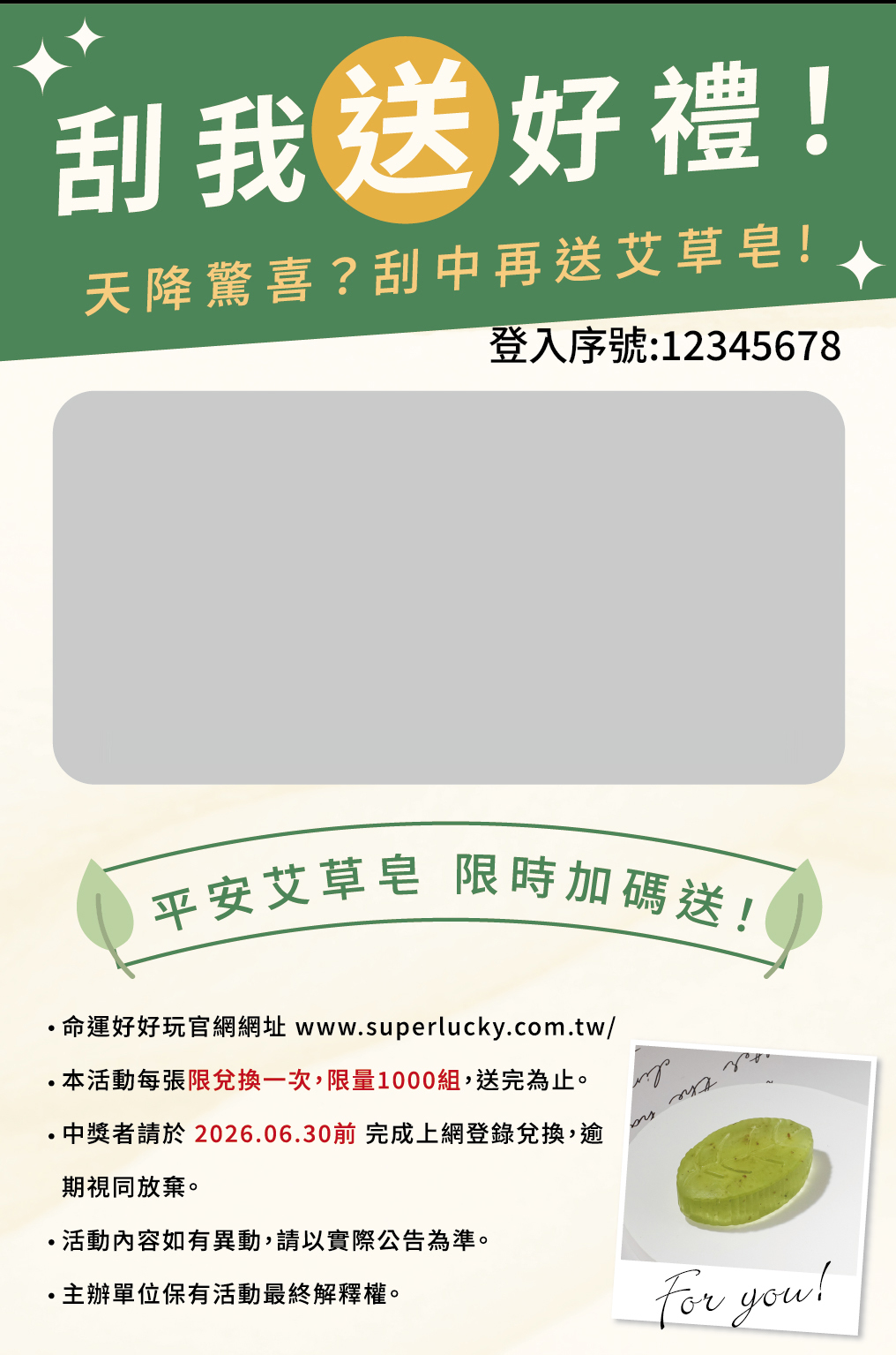 現在購買【鳳凰來儀開運紅內褲3入組】,立即贈送【平安艾草皂刮刮卡】1張!刮中再送1顆平安艾草皂,好運直接加倍送到你手上!天降驚喜、限量放送,送完就沒啦~想旺財、想轉運,就靠你的好手氣!