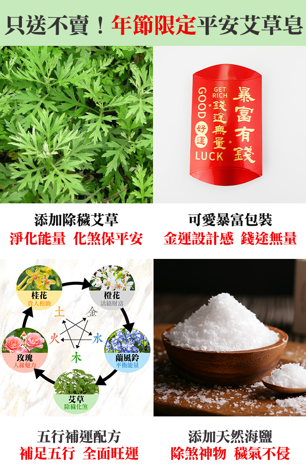 新年限定驚喜!凡購買紅內褲即特別加贈「平安除穢艾草皂」(30g),草本葉造型精緻討喜,融合艾草絨與艾草精油,雙倍釋放除穢能量,為你徹底淨化氣場。此款限定版艾草皂只送不賣,限量贈送,送完為止,千萬別錯過!