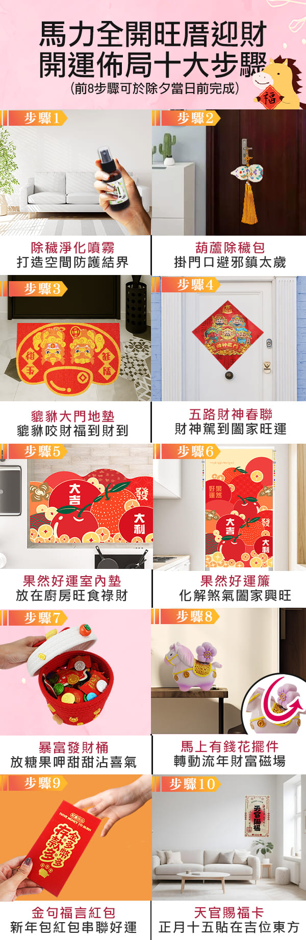 1.先使用除穢噴霧噴灑於居家空間→掛上除穢包→大門口鋪設紅地墊→貼上春聯→室內地墊鋪在廚房→換新門簾→將發財桶裝滿糖果→馬擺件放置於客廳或玄關→包紅包給家人、長輩→在家宅東方貼上天官卡。