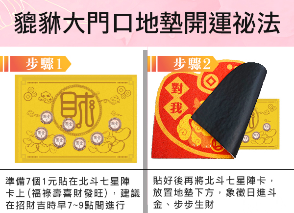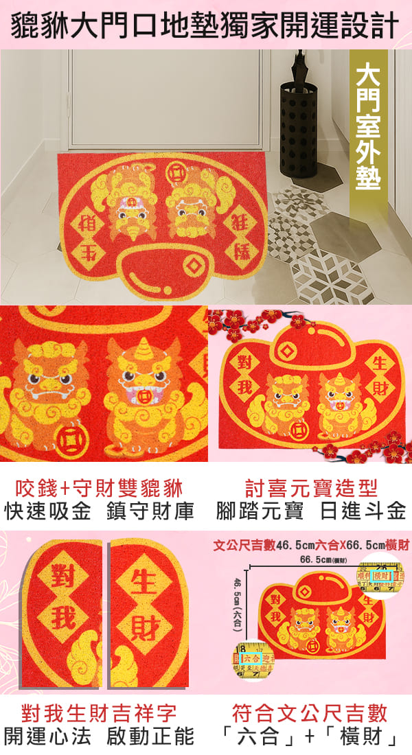 湯鎮瑋大師獨家設計「對我生財貔貅大門口地墊」,特別依照文公尺吉數訂製並結合流年風水概念,以元寶造型大紅地墊喜氣迎春+左右雙貔貅快速吸金,搭配對我生財字樣;放在住宅中最主要的納氣之口=大門口,接引地氣引財氣入宅,讓新的一年能步步生財、日進斗金!(貔貅地墊單品詳介)