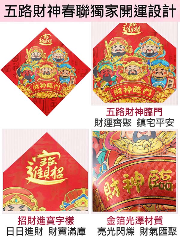 若想要一年開春就獲得超強吉運照拂,『貼春聯』這個步驟絕對不能馬虎!「五路財神進寶春聯」代表五路財神齊聚,帶來金銀財寶,同時鎮守家中保佑家庭成員平安!此款春聯特別設計金箔材質印製,光澤閃爍、進財效力加倍!