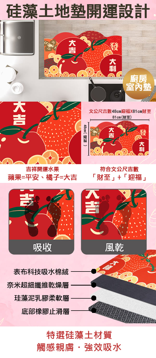 今年年特別設計這款「吉祥開運水果造型地墊」,以紅、橘色調象徵大吉大利+開運水果圓潤飽滿造型,搭配遍地錢幣;象徵食祿豐收無缺,闔家財運興旺!擺放在廚房=家中財庫之地,須隨時保持地面乾淨,有助於守住財氣!放在臥室也能有效催旺貴人財,讓你人脈生錢脈! (果然好運地墊單品詳介)