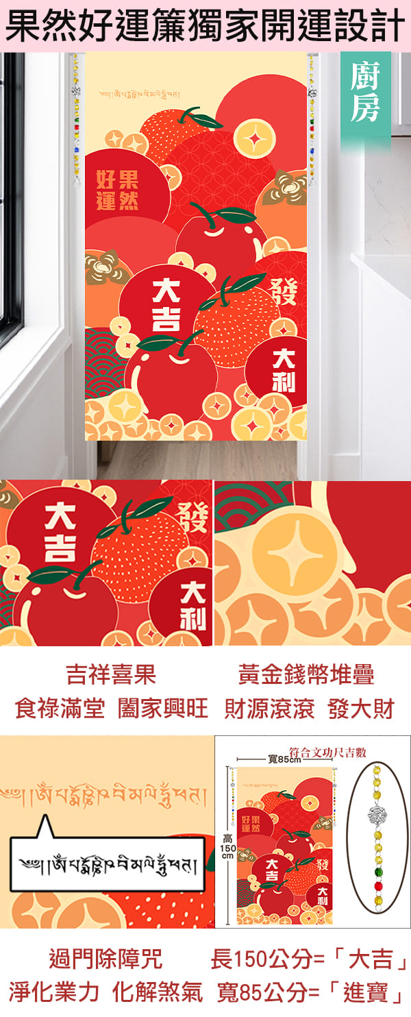替換掉家中泛黃褪色的門簾也是過年風水布局的開運要點之一!良好的門氣可以帶來家運的繁榮,「果然好運布簾」以圓潤飽滿的吉祥水果為主要設計,蘋果代表平安、橘子寓意吉利、柿子象徵事事如意,完美融合福氣與祝福。掛於廚房,象徵食祿豐盈,金玉滿堂;掛於臥室,增添喜氣氛圍,提升貴人運,財富自動上門來!(果然好運布簾單品詳介)