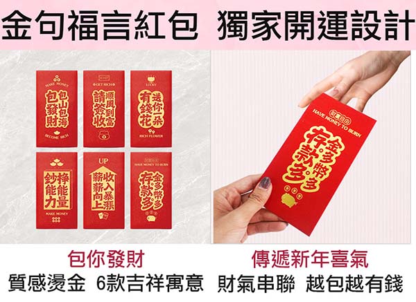 想要在新的一年財運豐隆、人脈生錢脈的話,還有一個必殺技祕法!就是在新春期間用「喜慶吉祥話紅包」搭配質感燙金的新年設計,啟動金印錢潮入袋!包給親朋好友,分享新春的喜氣能量,幫助你越包越有錢,來年財富旺翻天!