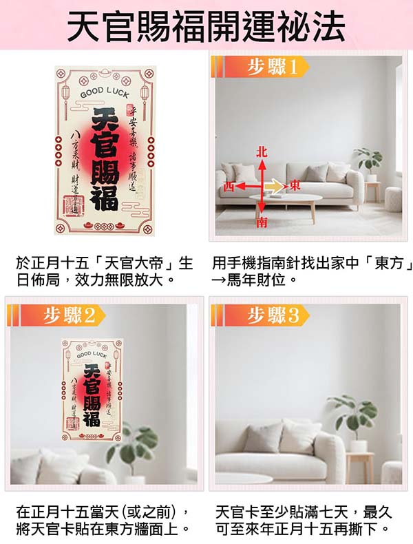 馬年開運過年組限定!「阿湯老師指定ê天官賜福開運法」:農曆正月十五(國曆2026.3.3)這天是天官大帝誕辰,在這天祈求天官大帝開天庫、賜下今年的財富會特別靈驗!「天官卡」須於正月十五當日(或之前)貼在或放置家中「東方」,至少需貼滿七天,或可至來年正月十五再換新,即在這一年闔家都可受到天官的庇佑。