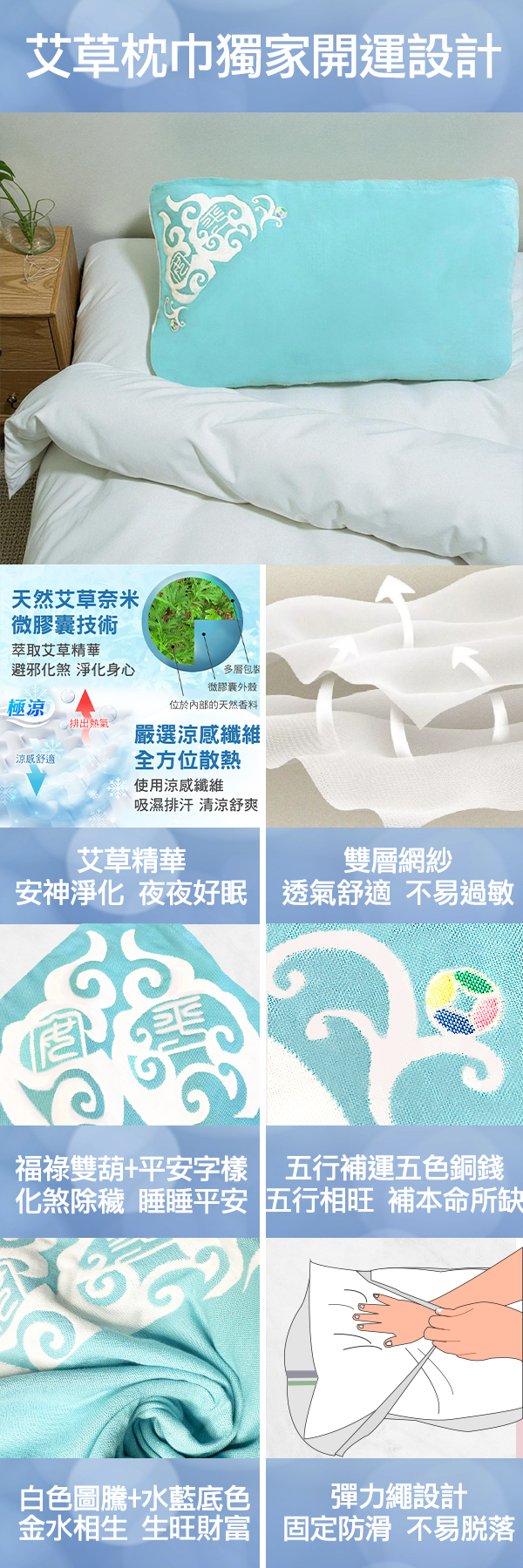 好眠平安枕巾採用採用雙層紗布工藝製成,帶來天然親膚、透氣吸濕的體驗,表層為優質精梳100%純棉紗材質,可避免肌膚因為潮濕引發過敏狀況,全家大小一年四季皆適用。另外擁有獨家好運設計:(1)福祿平安雙葫-化解負面磁場及穢煞之氣,凝聚正向能量。(2)五行補運銅錢-運用五行相生相旺的開運法則,補足先天八字本命五行所缺之能量,讓你好運倍增、廣招四方貴人。(3)藍白配色-以白色圖騰搭配水藍底色,金水相生可旺發財運,且藍色寢具給人放鬆的氛圍,有助於降低失眠機率,達到深層睡眠效果。(4)彈力繩設計-背面加上 鬆緊帶設計,可將枕巾固定於枕頭上,不容易跑位移動導致滑落,讓你怎麼翻身都安心。