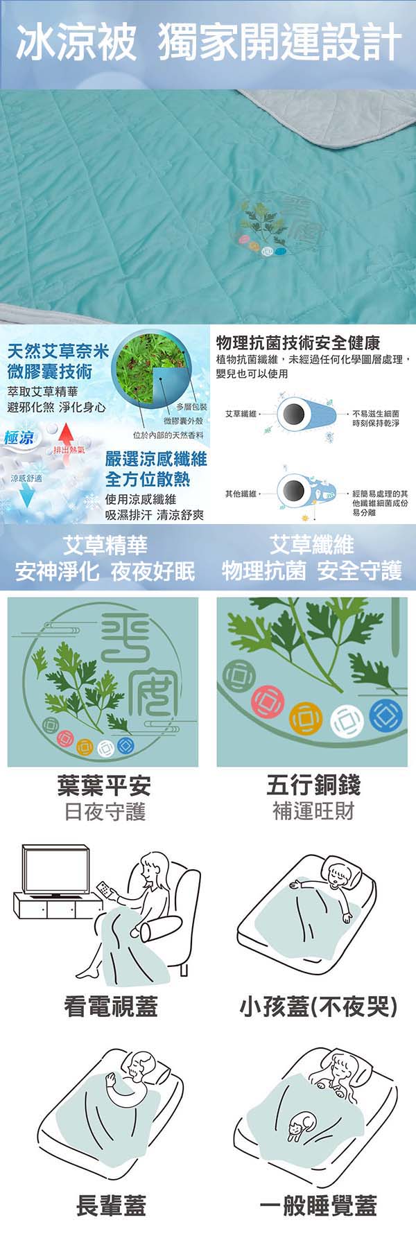 艾草冰涼被特別添加涼感纖維,全面提升被體涼感度,再搭配獨家開運設計:(1)葉葉平安-日夜使用都好眠。(2)五行銅錢-補運再招財。此涼被特別適用於體弱的長輩、睡眠不佳者或容易受驚的小孩,在涼感呵護的同時有安神定魄之效,輕鬆改善睡眠品質得到個人元神光彩!除了睡眠使用也適合一般休憩時披蓋使用;另有附贈防塵收納袋,不但收納便利同時也十分美觀,亦可當作贈送親友的伴手禮。