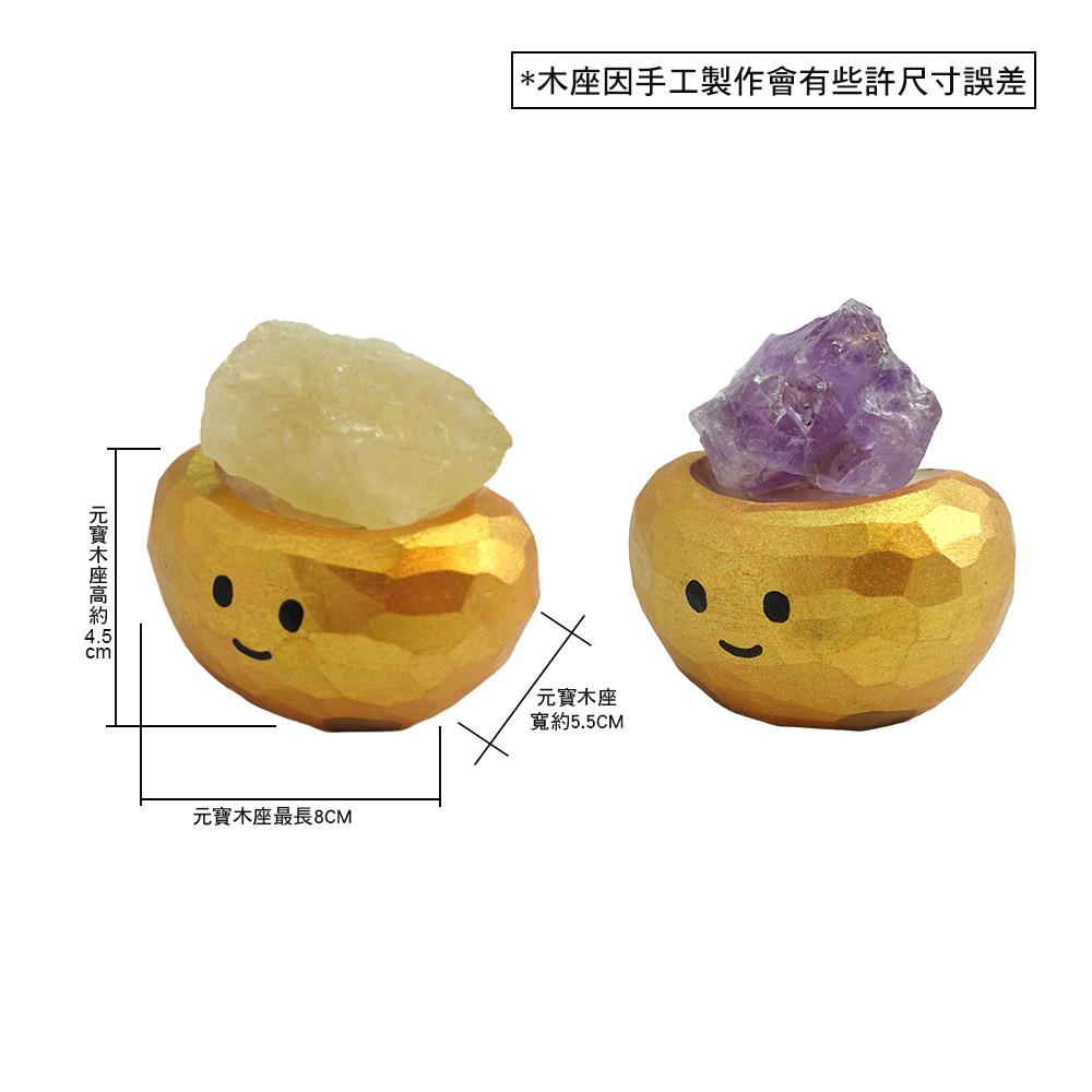 兩款原礦皆為自行黏貼設計,可依喜好調整角度與層次,手工木雕元寶紋理各異、天然礦石大小、形狀、色澤皆不同,獨一無二更具收藏價值。雙入組元寶寶色彩繽紛、療癒加倍,自用送禮都到位,輕鬆打造療癒又開運的心機小佈局。