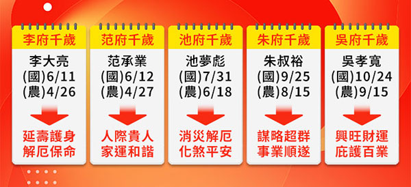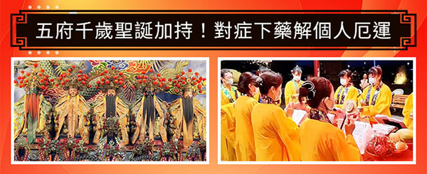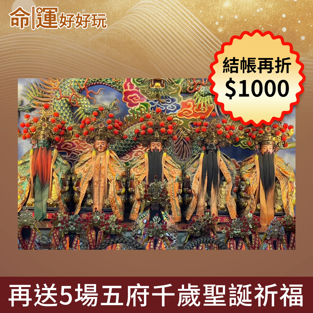 五位千歲各司其職,靈力互補!對症補運、各有所長,現在報名天赦日法會圓滿大全套就送5場五府千歲聖誕祈福修法,可針對不同運勢需求、強化不同運途能量,針對身體、事業、人際、財運、災厄等難題逐一補強!