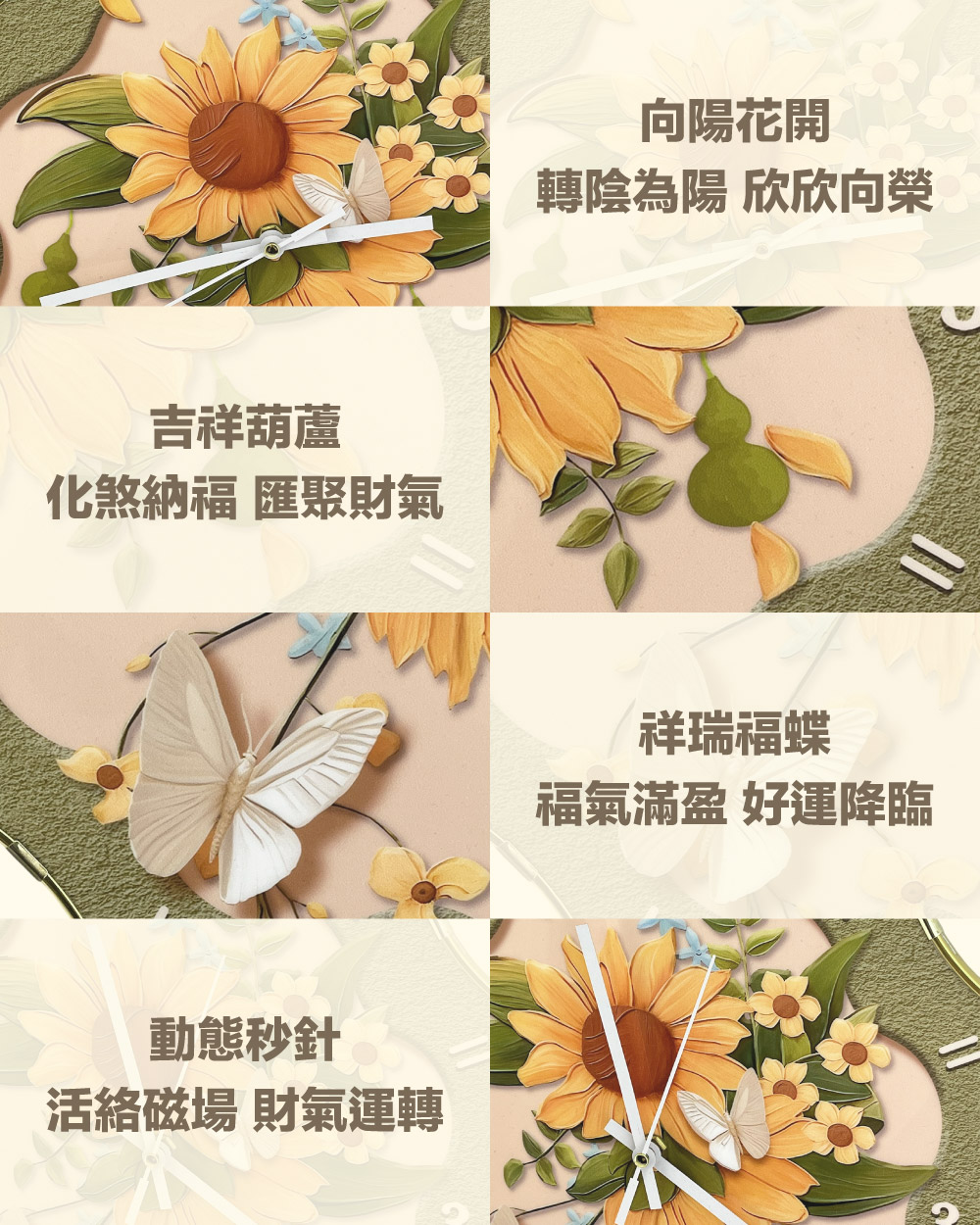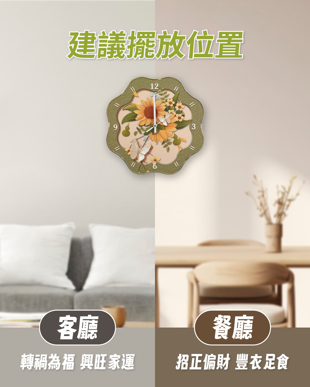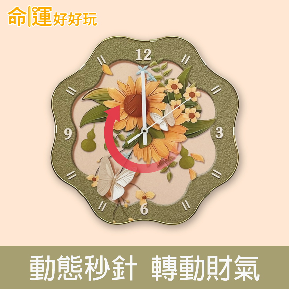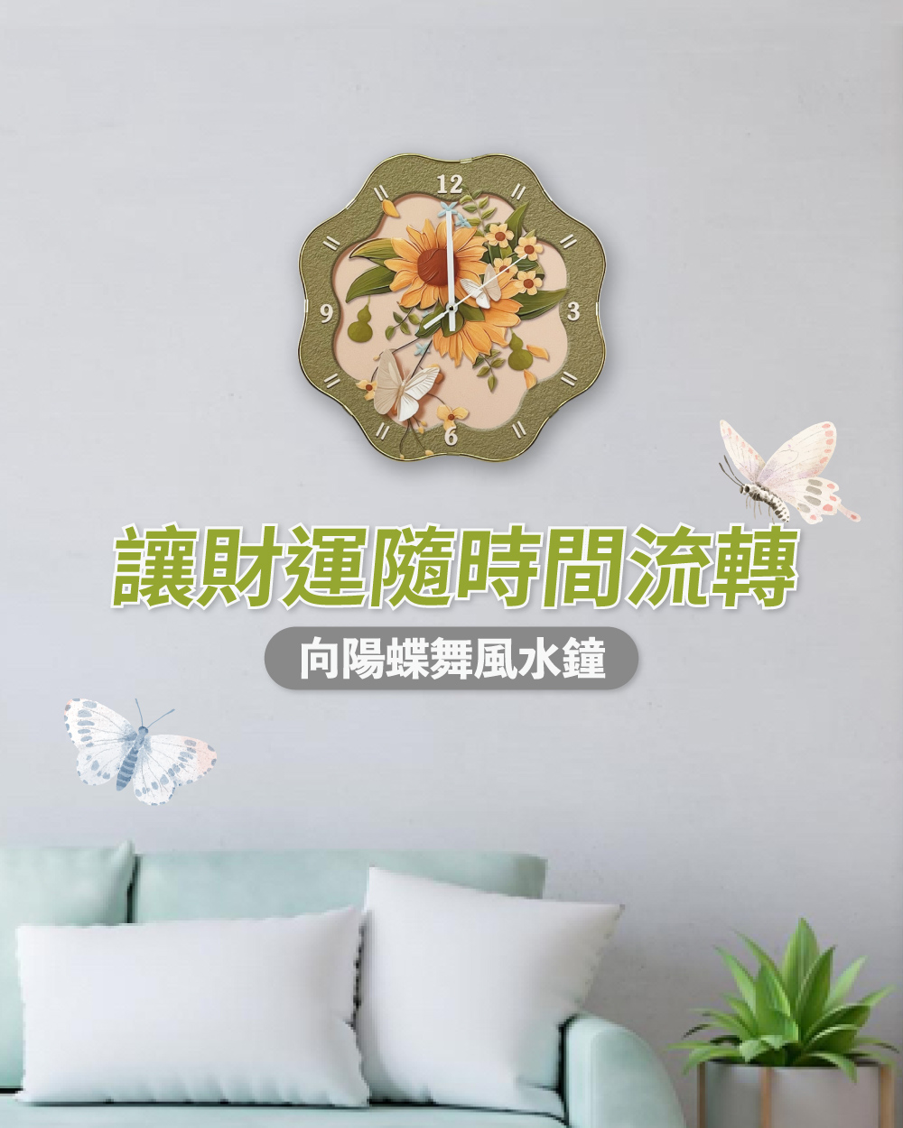 向陽蝶舞風水鐘是一款結合開運寓意及田園清新感的高顏值掛鐘,鐘面以向陽花、葫蘆、蝴蝶等開運元素設計,具有「阻擋財煞、聚氣生財」的寓意,其不規則狀金框設計搭配秒針運行,象徵框住財富、分秒進財,時刻催旺財富好運磁場,輕鬆打造越住越有錢的開運黃金屋!