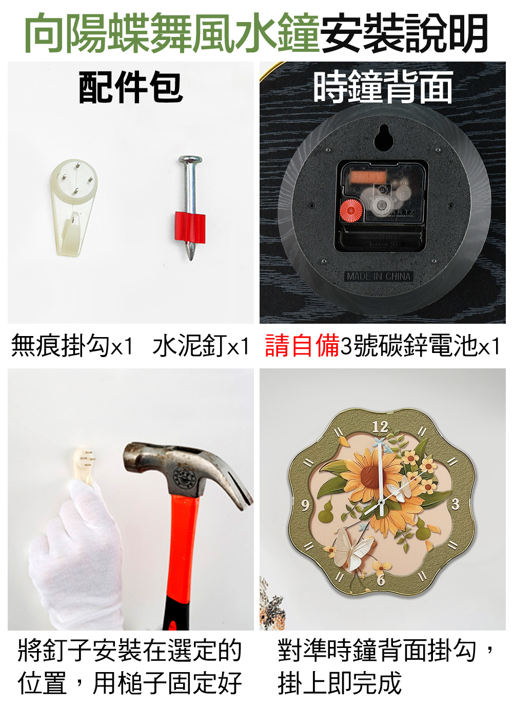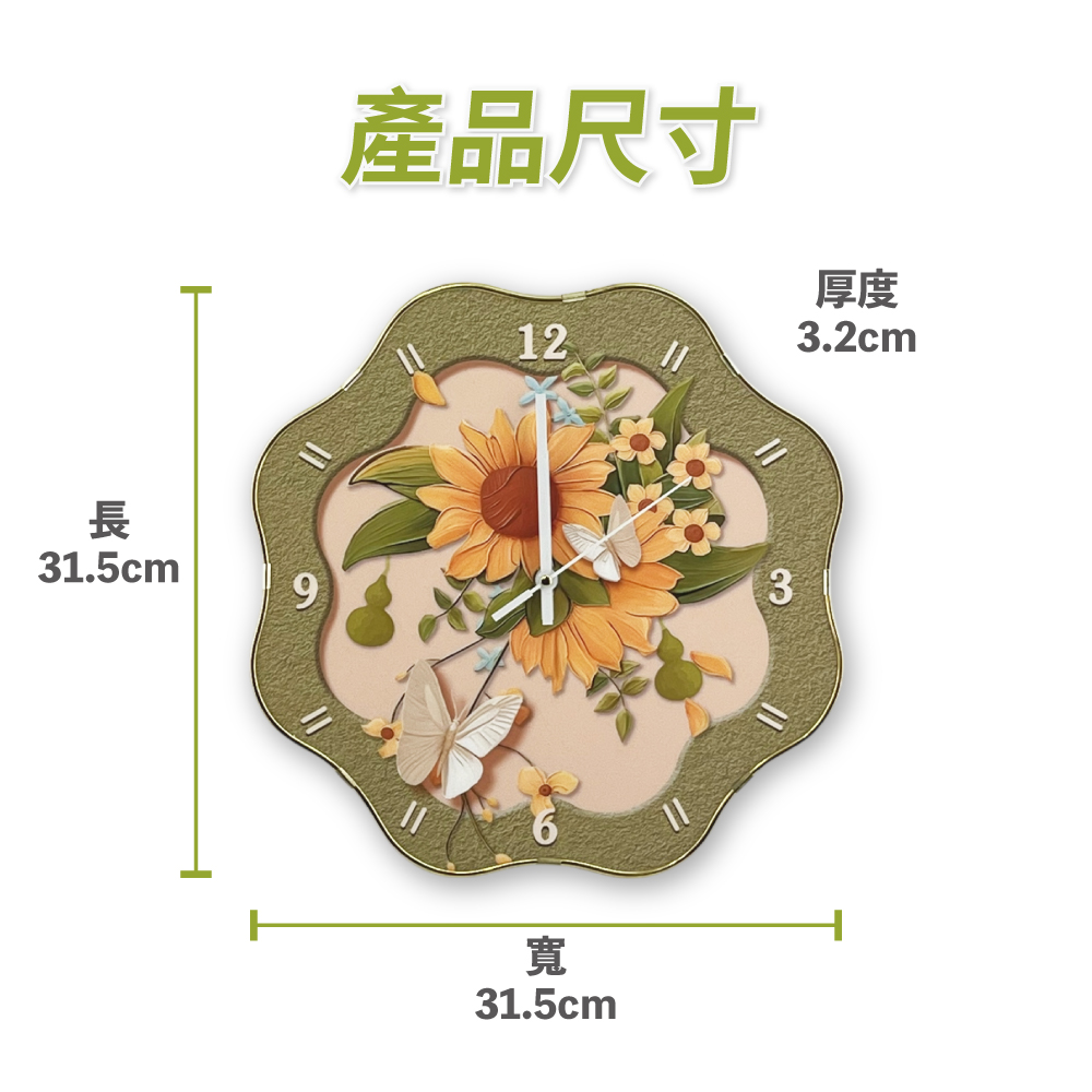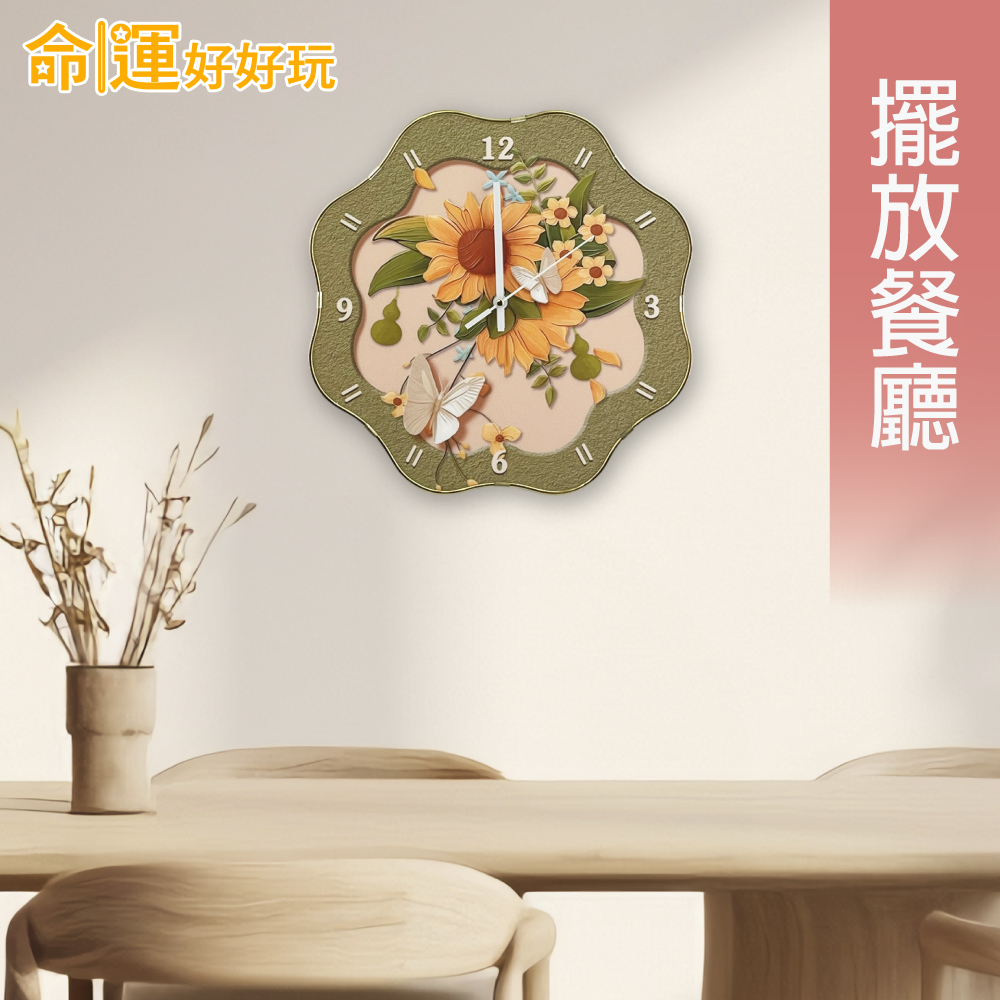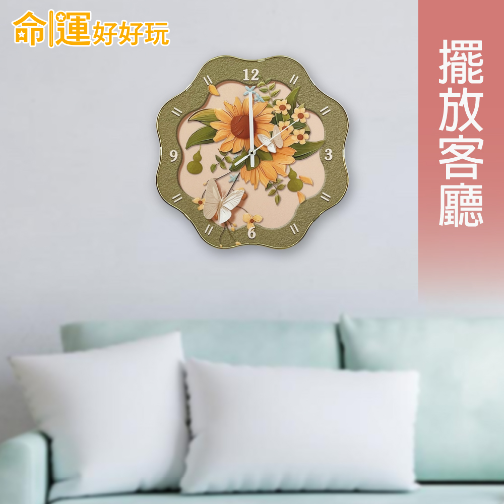 向陽蝶舞風水鐘是一款結合開運寓意及田園清新感的高顏值掛鐘,鐘面以向陽花、葫蘆、蝴蝶等開運元素設計,具有「阻擋財煞、聚氣生財」的寓意,其不規則狀金框設計搭配秒針運行,象徵框住財富、分秒進財,時刻催旺財富好運磁場,輕鬆打造越住越有錢的開運黃金屋!
