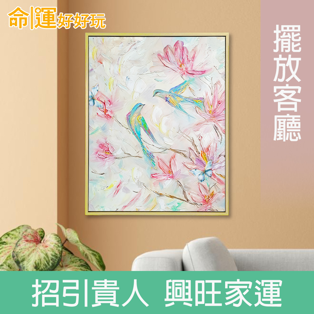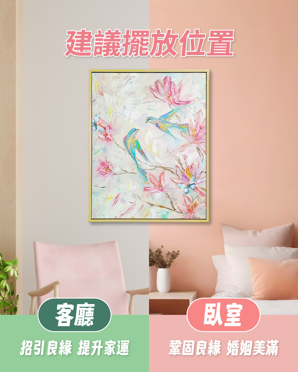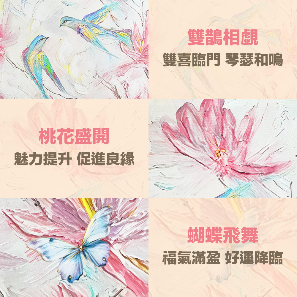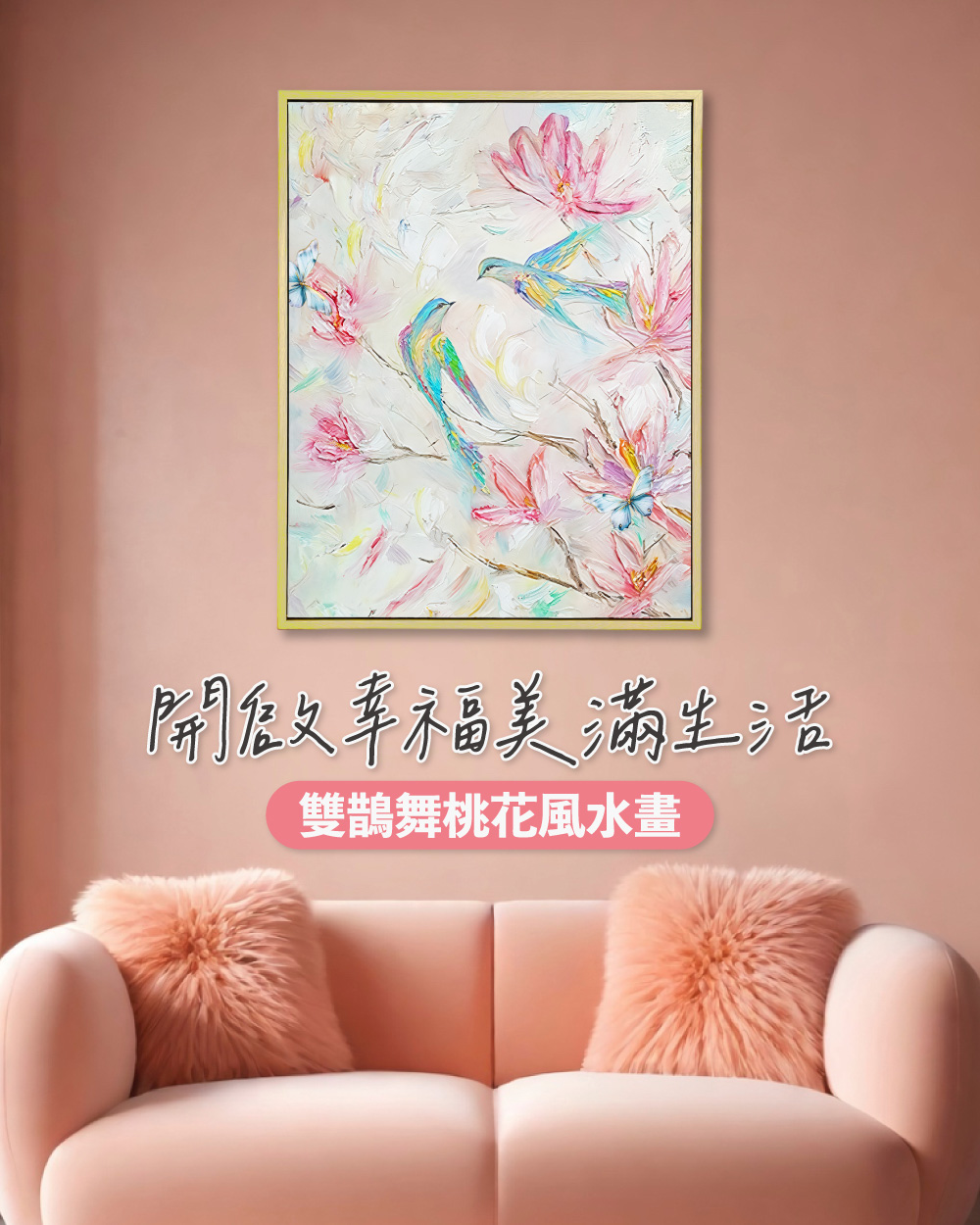 家,是乘載生活的容器,而牆上的風景,則是質感生活的延伸。這幅「雙鵲舞桃花風水畫」以極具溫度的油彩筆觸,細膩營造出充滿微甜的舒適氛圍,以啟動桃花人緣的輕柔粉色為主要色調,溫柔喚醒個人的桃花磁場,讓你舉手投足間都充滿魅力與自信光采,輕鬆化身為人見人愛的萬人迷;畫中兩隻喜鵲姿態優雅、互相凝望,寓意捎來佳音、好事成雙;象徵個人魅力的桃花綻放於畫中,為你催旺人緣桃花,吸引貴人靠近;蝴蝶翩翩飛舞於桃花之間,象徵福氣層層疊加,幸福翩然降臨。畫中的每一個元素,都象徵著美好的祝願,將好運自然融入於生活日常,為日常生活注入一股溫馨幸福的暖流。