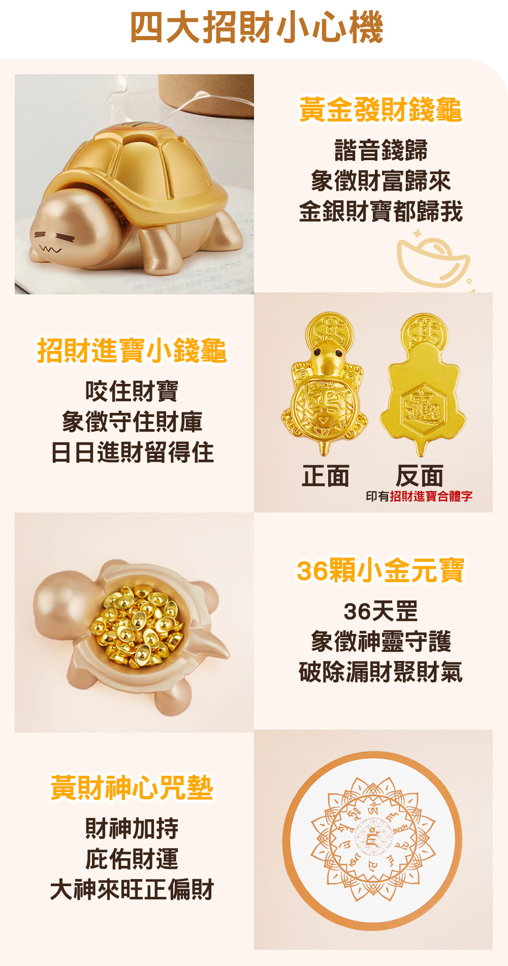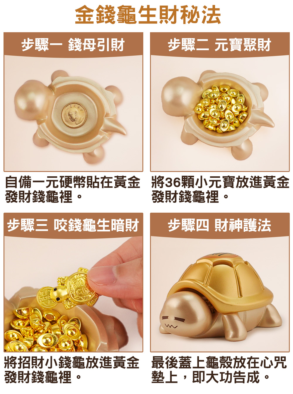 金錢龜來聚寶鎮有多會招財?首先,龜殼內的先迷你小錢龜象徵大龜生小龜=雞生蛋、蛋生雞,財富能量相生不息。第二,36顆金元寶代表36 天罡神力,在龜殼裡開啟護財結界,幫你擋掉財煞破財,把好機會和好財運都鎖在你身邊。第三,放進一枚你自己的1元錢母,讓整個錢龜鎮能量與你相應、為你所用。最後,把錢龜鎮安坐在黃財神心咒墊上,就像請財神親自下凡幫你撐腰護法,財氣穩穩在線,賺錢底氣直接拉滿,無論是家裡財位、辦公桌旁,還是店面櫃台,都很適合擺上一隻錢龜坐鎮。上班族拿來守薪水、業務用來衝業績、老闆則補財庫,每隻「龜系守財員」,讓錢乖乖待在你身邊不亂跑!