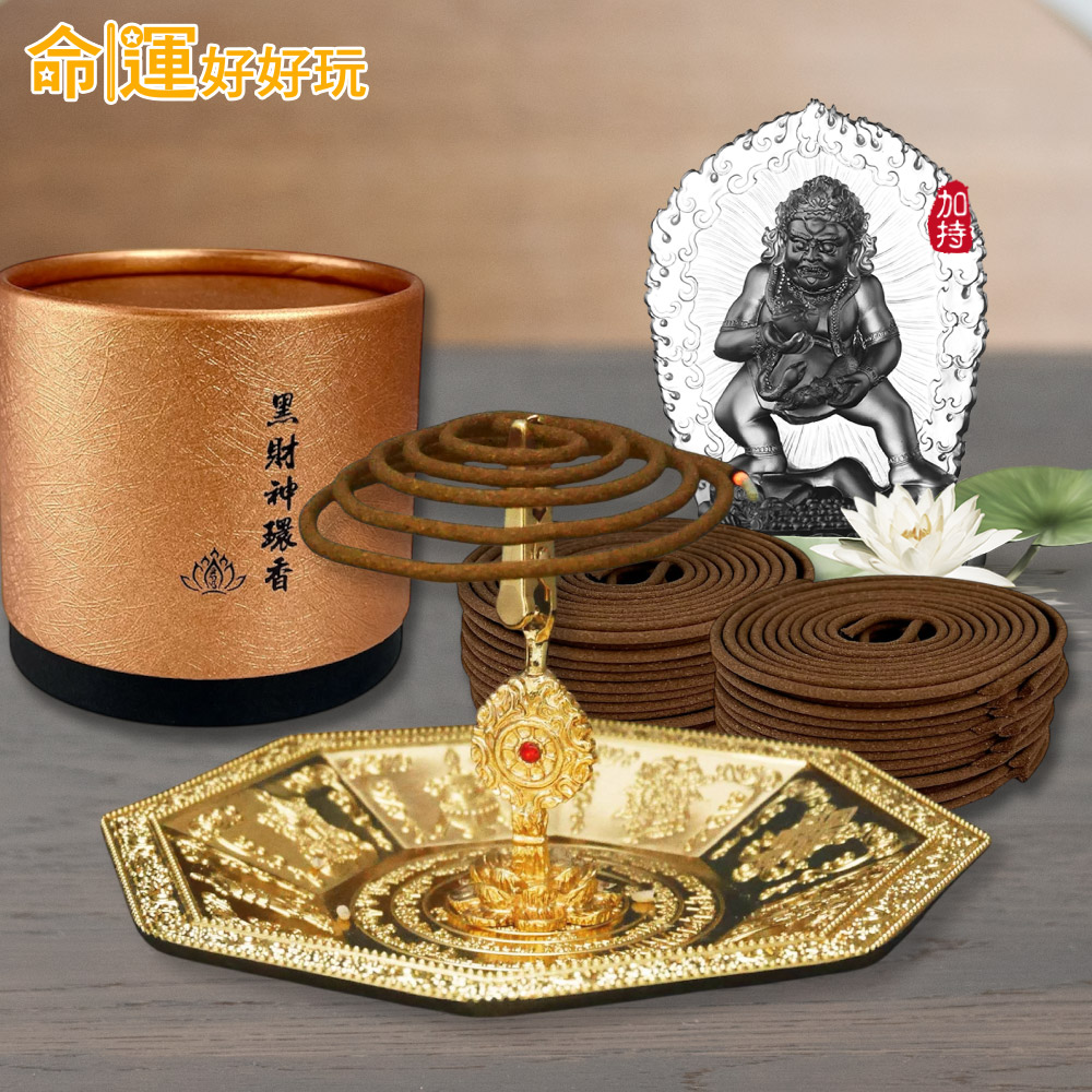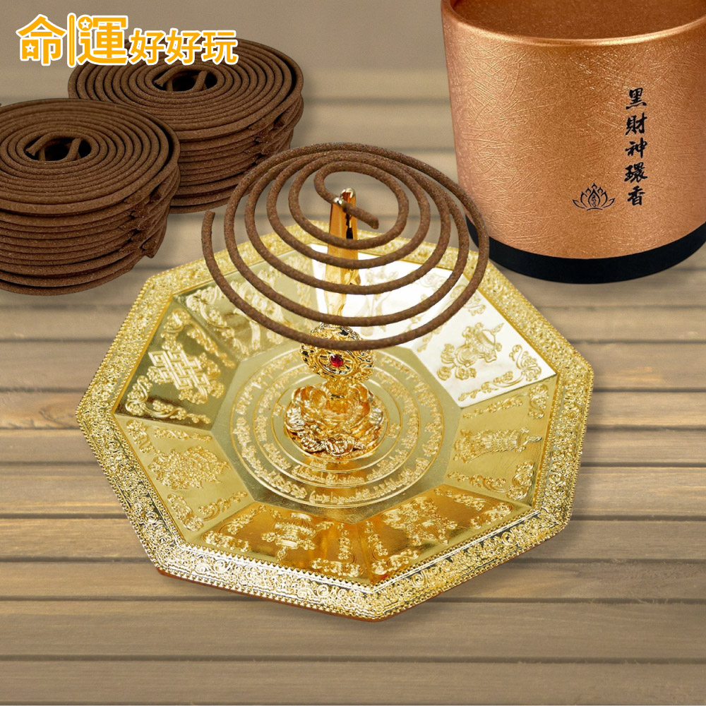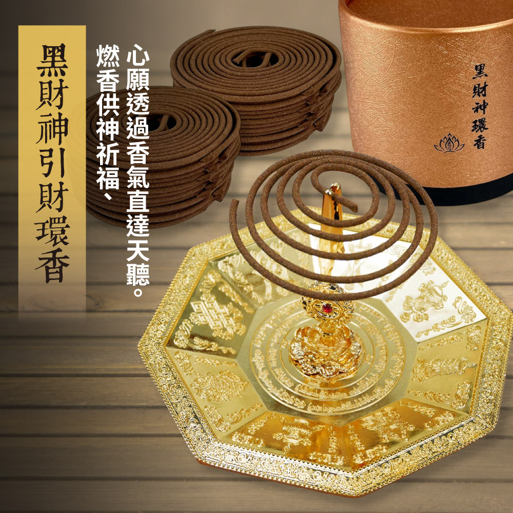 本超值組結合(1)經由黑財神加持的環香(2)再搭配殊勝八吉祥法器香盤,為你迅速點亮財庫,催旺財運,讓居家環境、辦公室、店面都能讓財氣環繞,財源廣進。