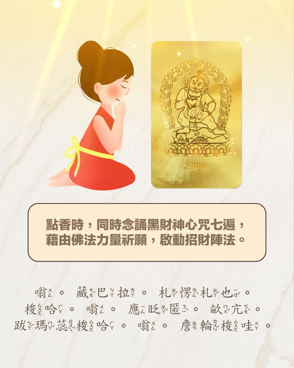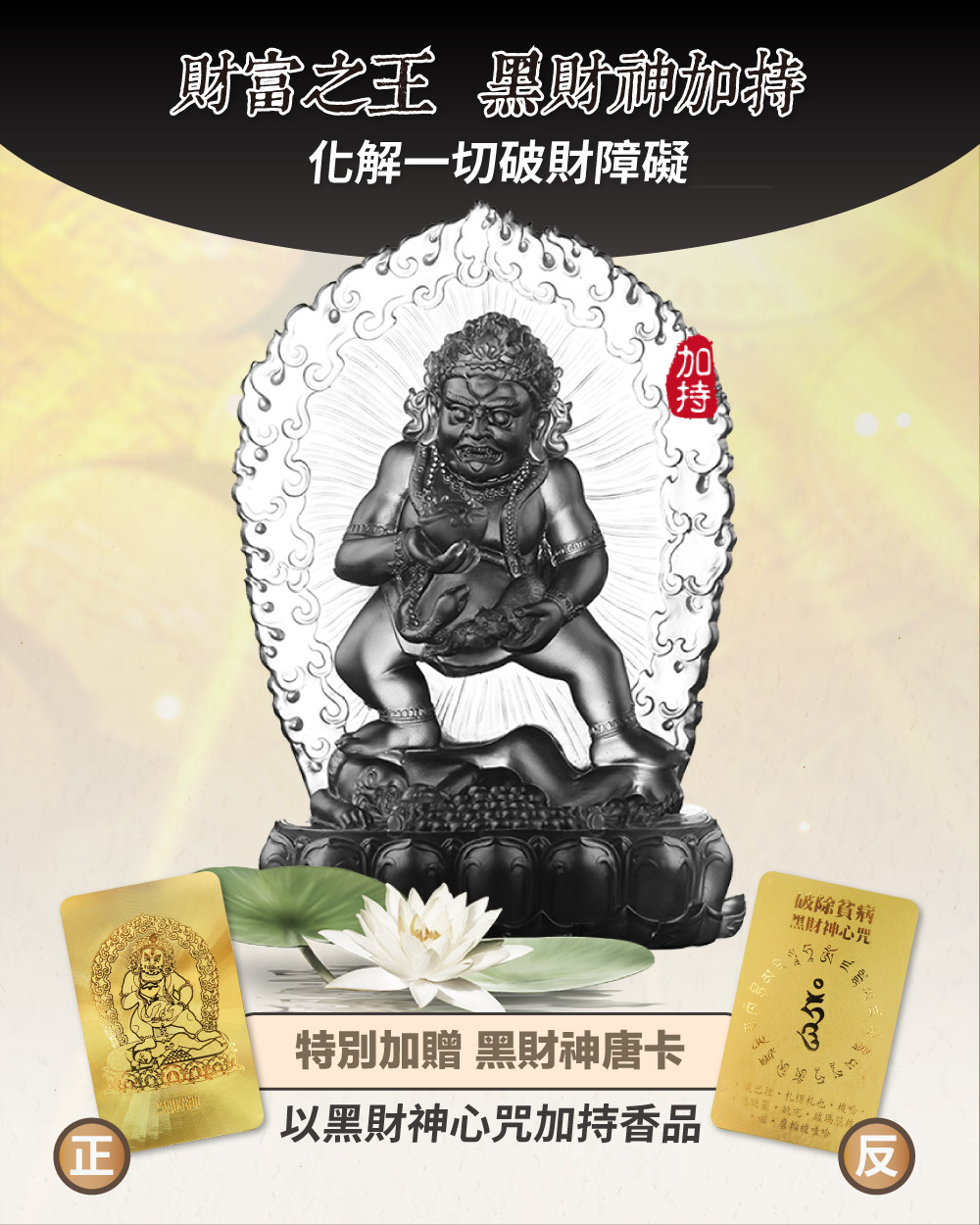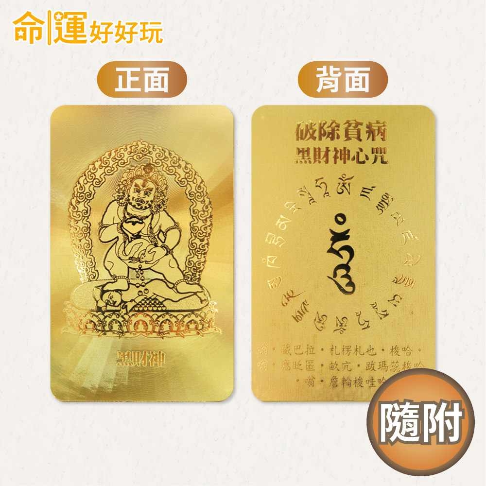 特別隨附「黑財神心咒卡」,祈請黑財神庇佑加持,化解一切違緣障礙,廣納八方財氣,為你啟動專屬的催財結界!