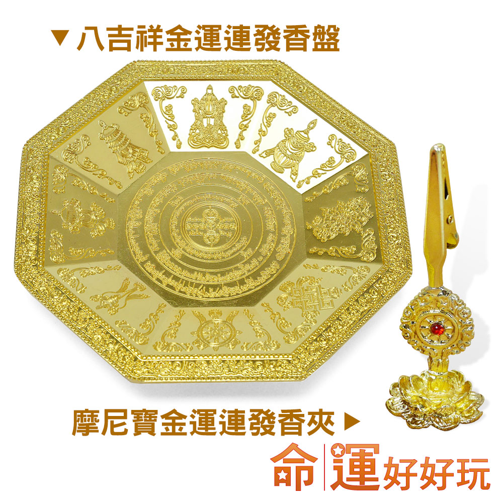 《八吉祥金運連發香盤組》結合八卦與藏傳八吉祥的化煞招財能量,為你的財庫坐鎮,即刻開啟八種富貴運勢;摩尼寶香夾替你緊緊夾住財富,讓你進財如意順利,招財守財一次到位。