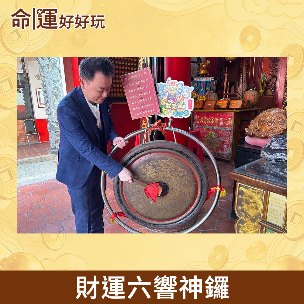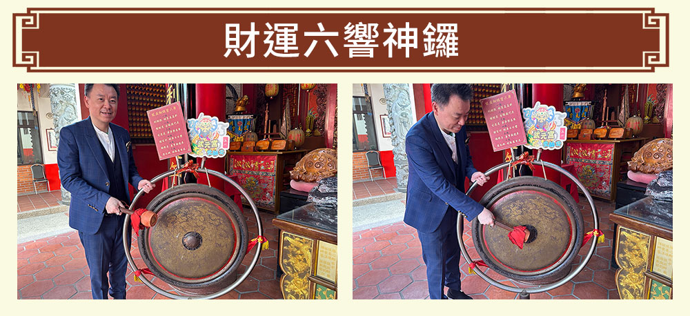 小孟老師親自敲響「鎮廟財神銅鑼」開財路、震煞氣,每一敲皆啟動不同層次的流年好運,為信眾層層推動財勢與人生運程。