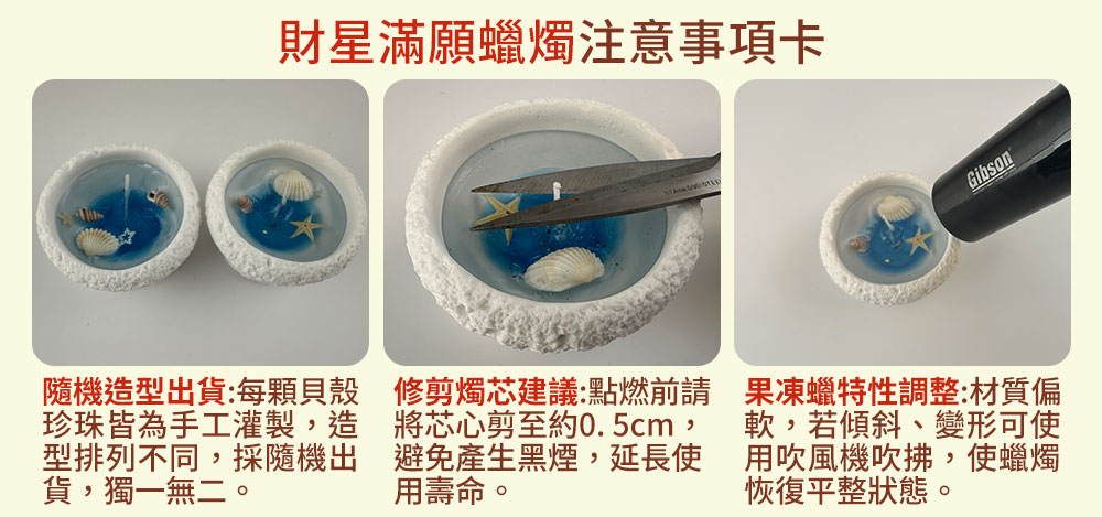 宛如海洋寶藏般的晶瑩蠟燭,內藏聚財能量,每一次燃燒都為你召喚正財偏財,幫助事業順利、貴人上門、錢財不斷進門!適合祈願招財、業績成長、翻轉財庫命運!