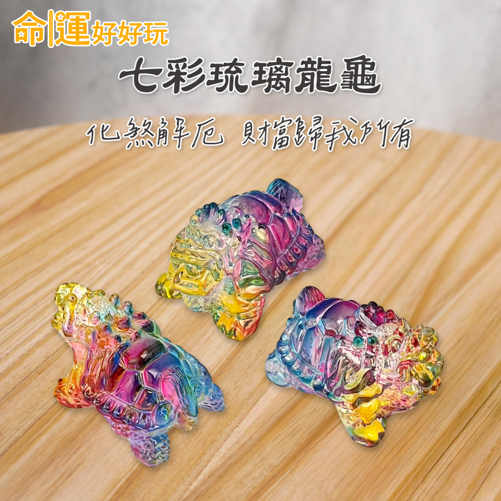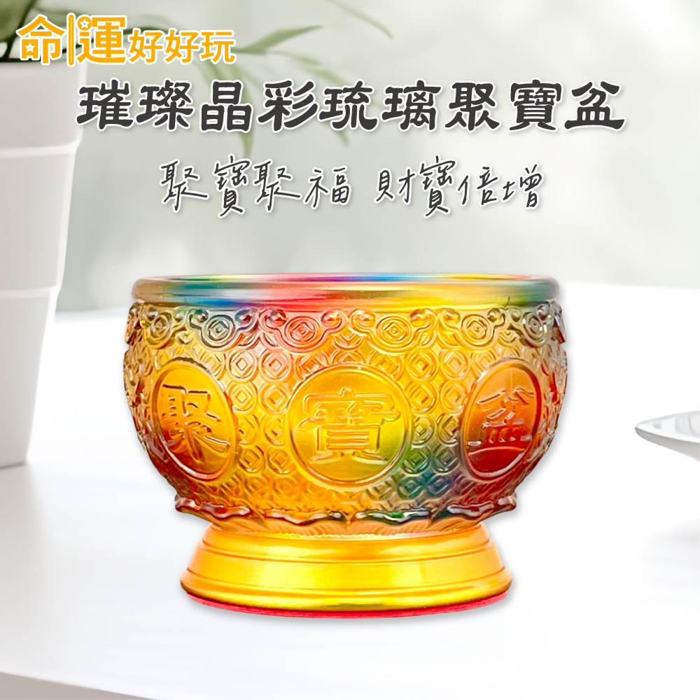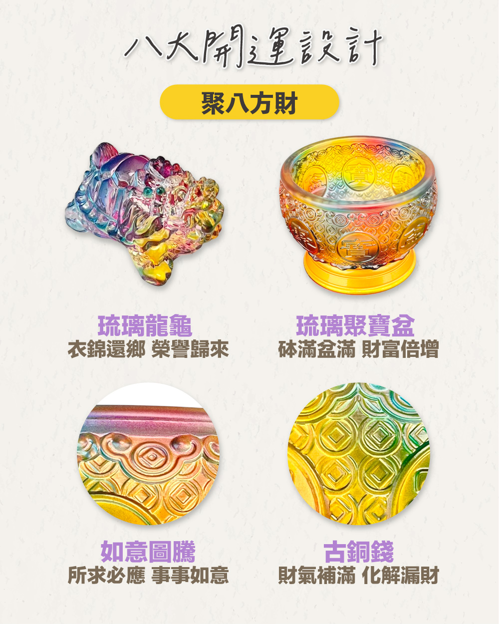 「七彩琉璃龍龜聚寶盆」使用彩色琉璃高溫燒製,色彩璀璨繽紛、晶瑩耀眼、獨一無二,且琉璃為佛教七寶之一,具有祛病避邪、招財納福的能量,其五行配色不僅能提升居家質感,更能補足先天五行所缺。此擺件結合兩大招財聚財法寶-神獸龍龜與聚寶盆,龍龜為你鎮守財富、招來貴人,聚寶盆為你匯聚財氣、提升財運,再搭配獨家聚財祕法完整佈局,讓你由內而外催旺財富磁場,打造滴水不漏的聚富寶庫。