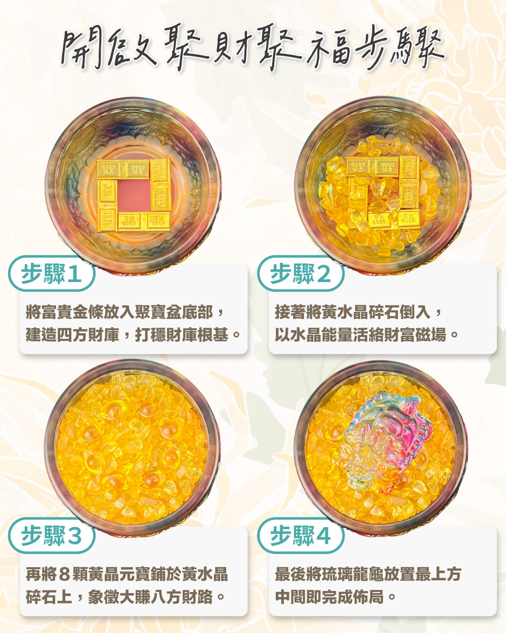 在風水佈局中,「聚寶盆」象徵我們的財庫,可匯聚財氣,固守財庫不漏財。依上圖開運祕法四大步驟在聚寶盆內放入龍龜、黃水晶碎石、黃晶元寶與富貴金條等催旺財富祕寶,可招引財富貴人,讓進財順暢不卡關,更可化解漏財煞氣,告別零存款、月光族悲慘命運。