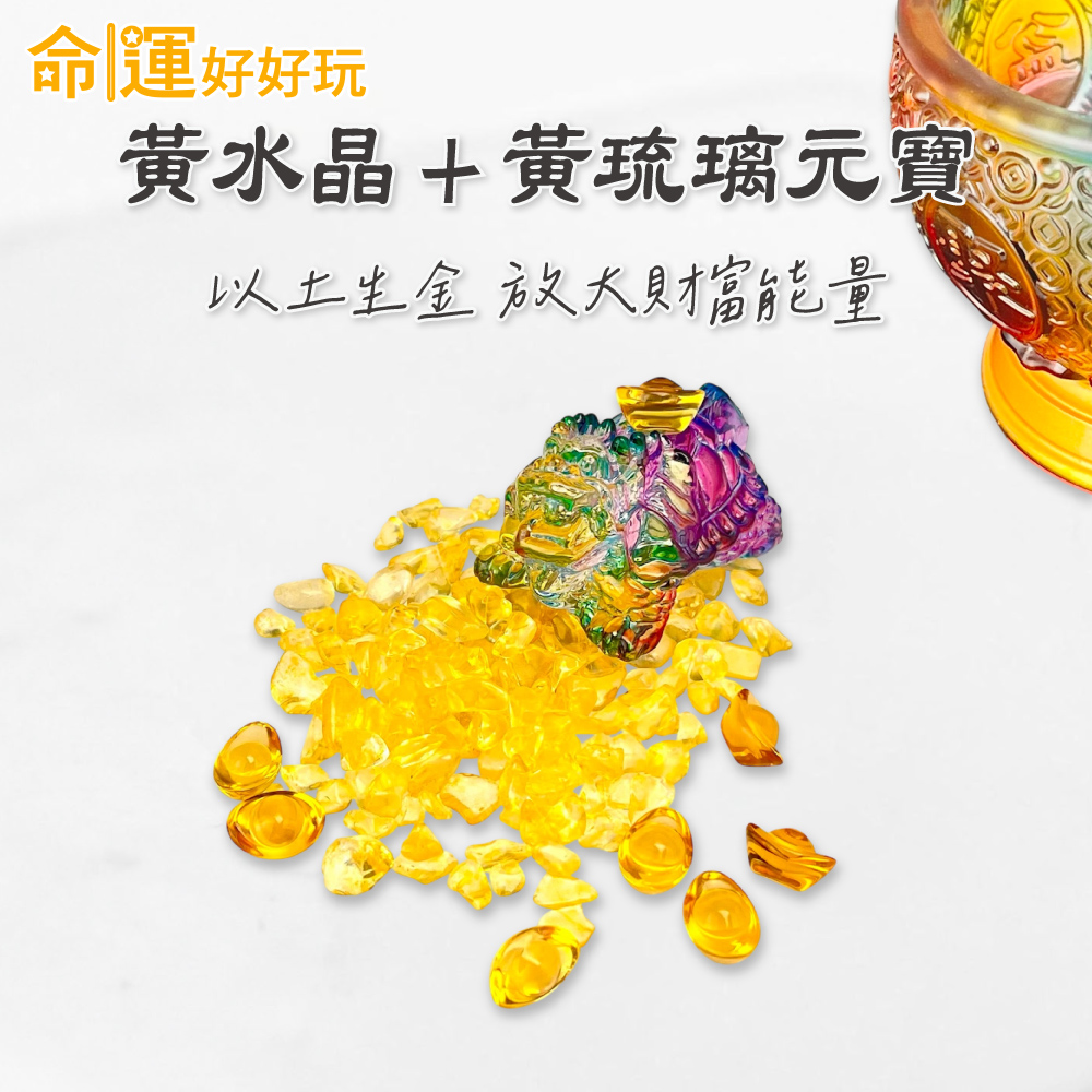 黃水晶被譽為財富之石,擁有匯聚財氣、穩定進財的能量,在聚寶盆內放入黃水晶碎石,可活絡正財及偏財運勢,帶來偏財運與生意緣。