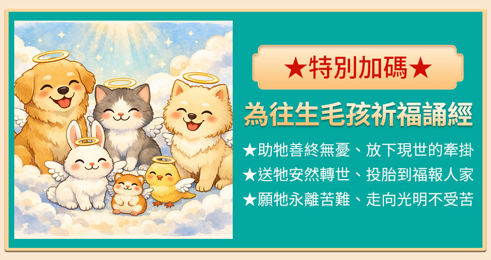 ★特別加碼★為往生毛孩祈福誦經,我們都知道寵物也是我們的家人!法會特別安排為毛孩誦經,幫助牠們放下這輩子的牽掛,安心前往更好的地方,投胎到有福報的人家過好日子。→點此前往報名祈福