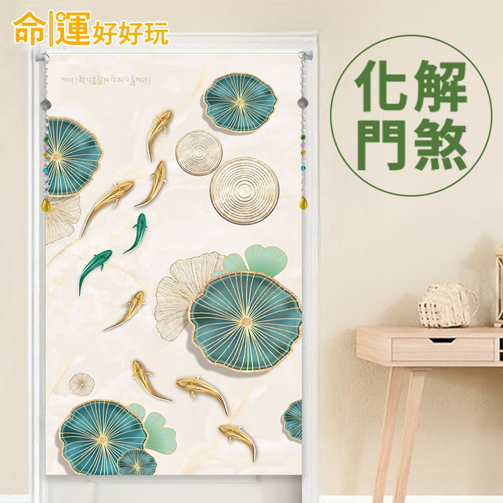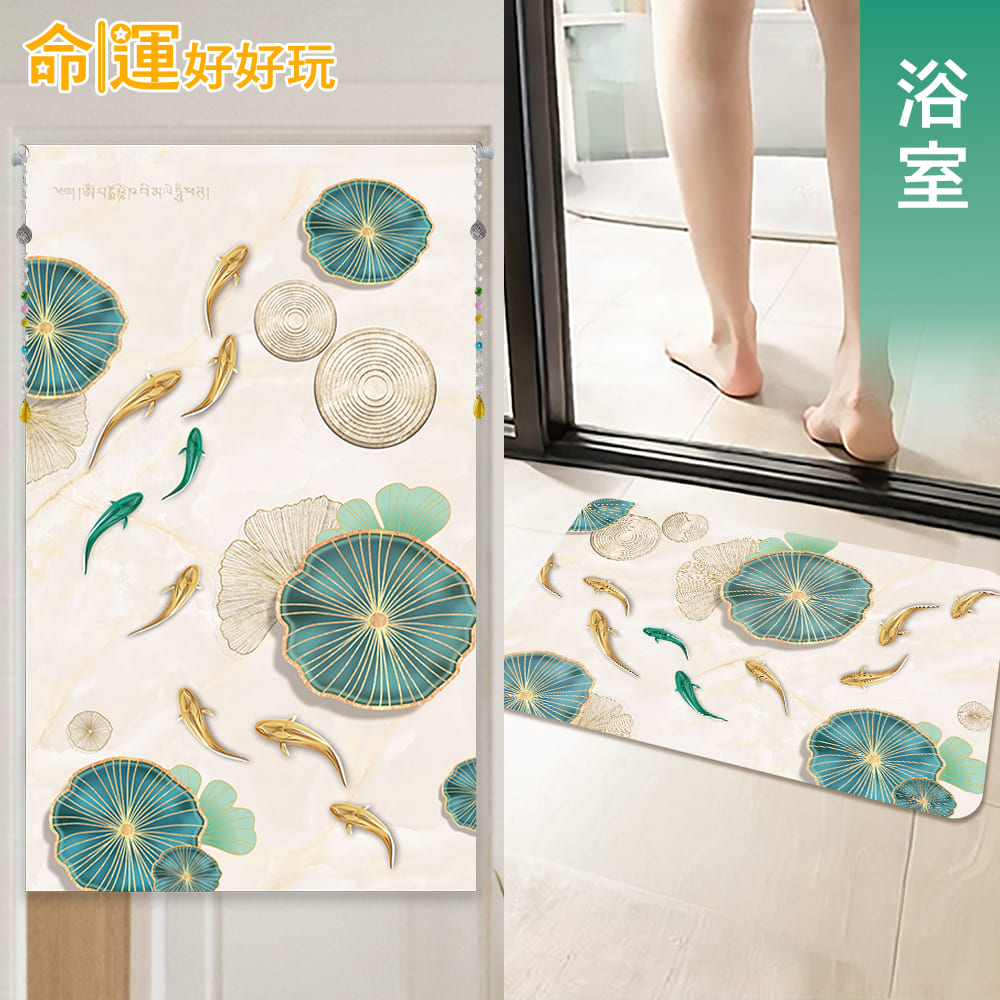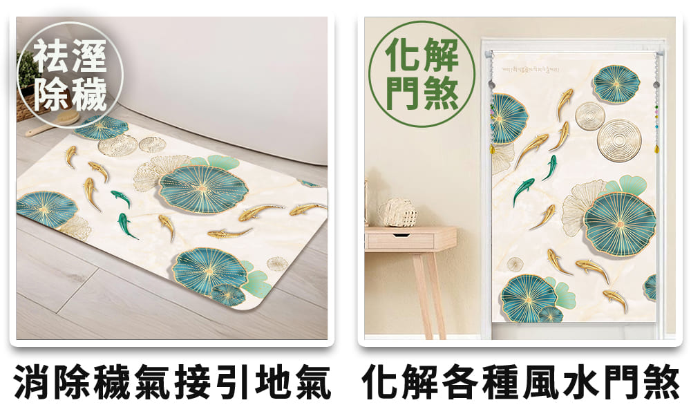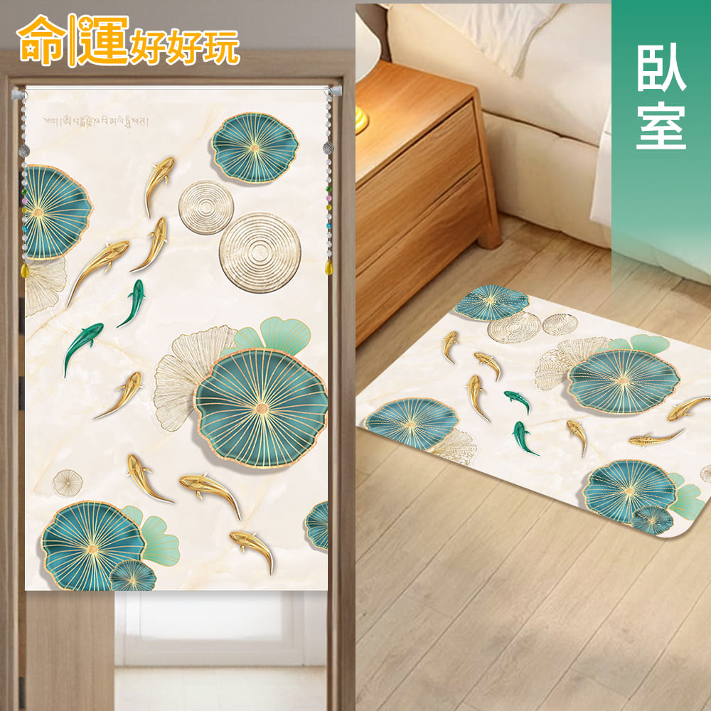 門是「氣」的進出口,若遇上「門對門」或「廁所對床」等煞氣,容易形成漏財格局,往往會影響居住者的運勢。簡單運用「門簾」與「地墊」這對開運神隊友,就能低成本打造完美的居家磁場,此款布簾+硅藻土地墊風格清新適合春夏氛圍,結合了「富貴九魚」及「福氣荷葉」等開運元素,除了兼顧美化空間及實用性,更能夠化解煞氣、提升財運。